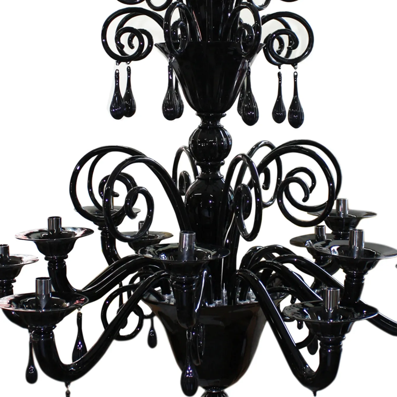 This majestic chandelier has twelve lights and can feature two or three tiers of lights. Each tier is decorated at the top with a series of curls with pendants. The same pendants adorn also the curve of each arm.