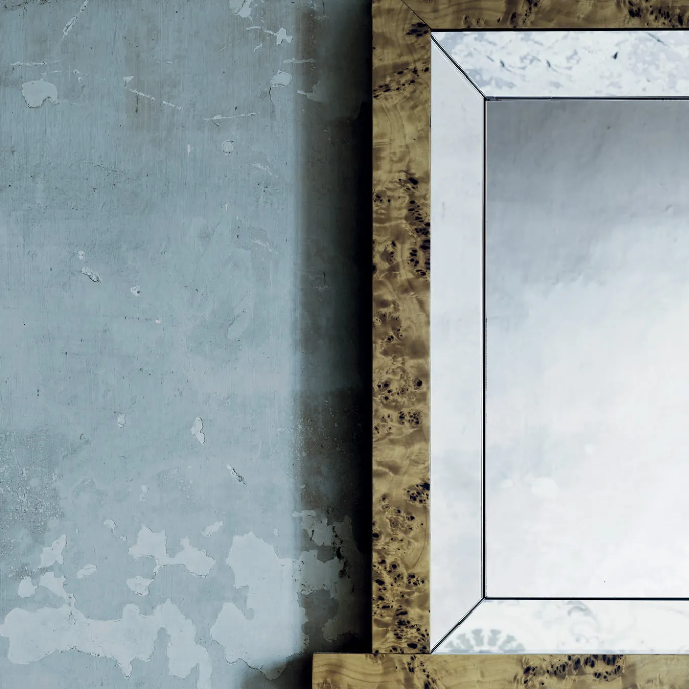 Capturing the timeless elegance of simple forms, this mirror by showcases a refined popular brier wood frame with an extended side at the base. The beveled inside mirror adds dimension to the piece while enhancing the contrast with the warm-hued frame.