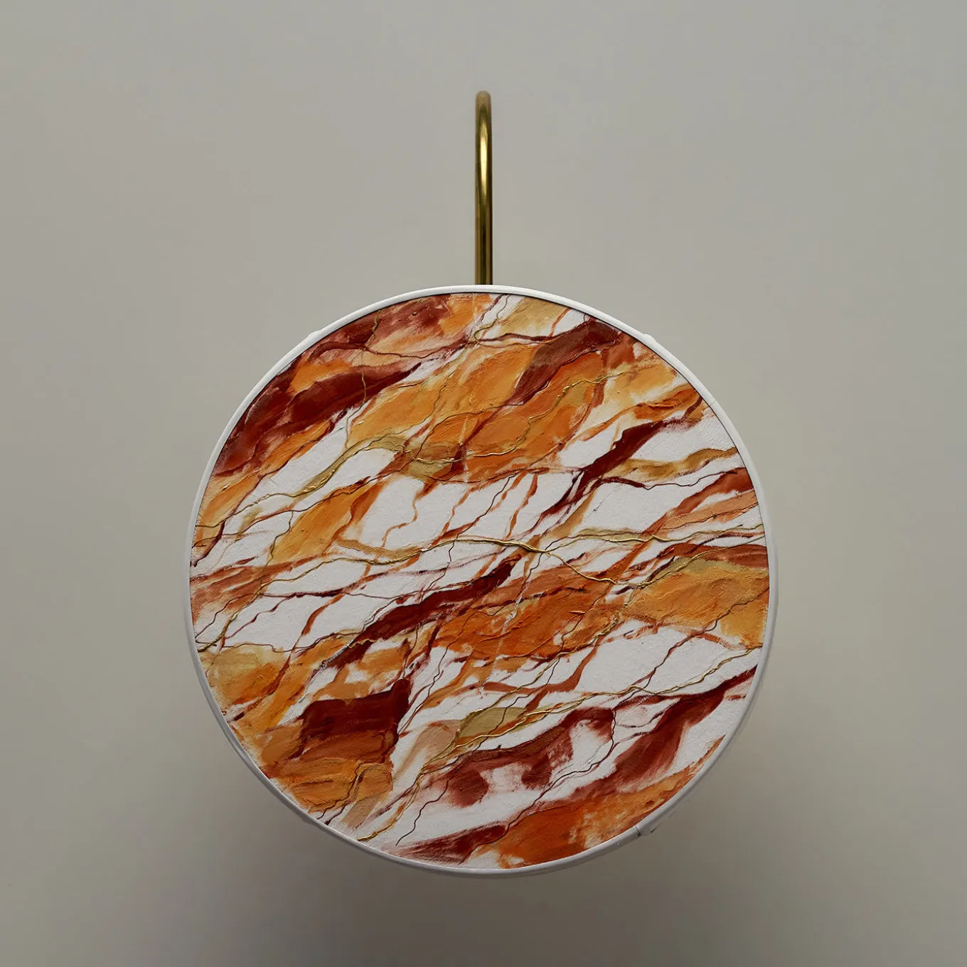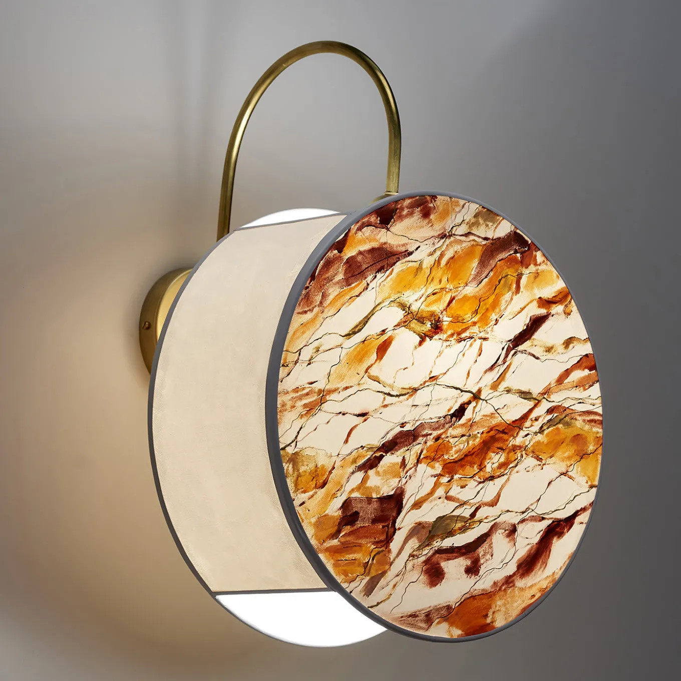 The front of the Mandarin Lampshade is entirely hand-painted with infinite gradations in tangerine and dark orange, burnt and light earth coloring with streaks and flecks in dull gold. The velvet base of this exquisite lampshade accentuates the stucco relief in every color detail. Light enhances the nuances and the preciousness of ivory velvet completes this splendid piece.