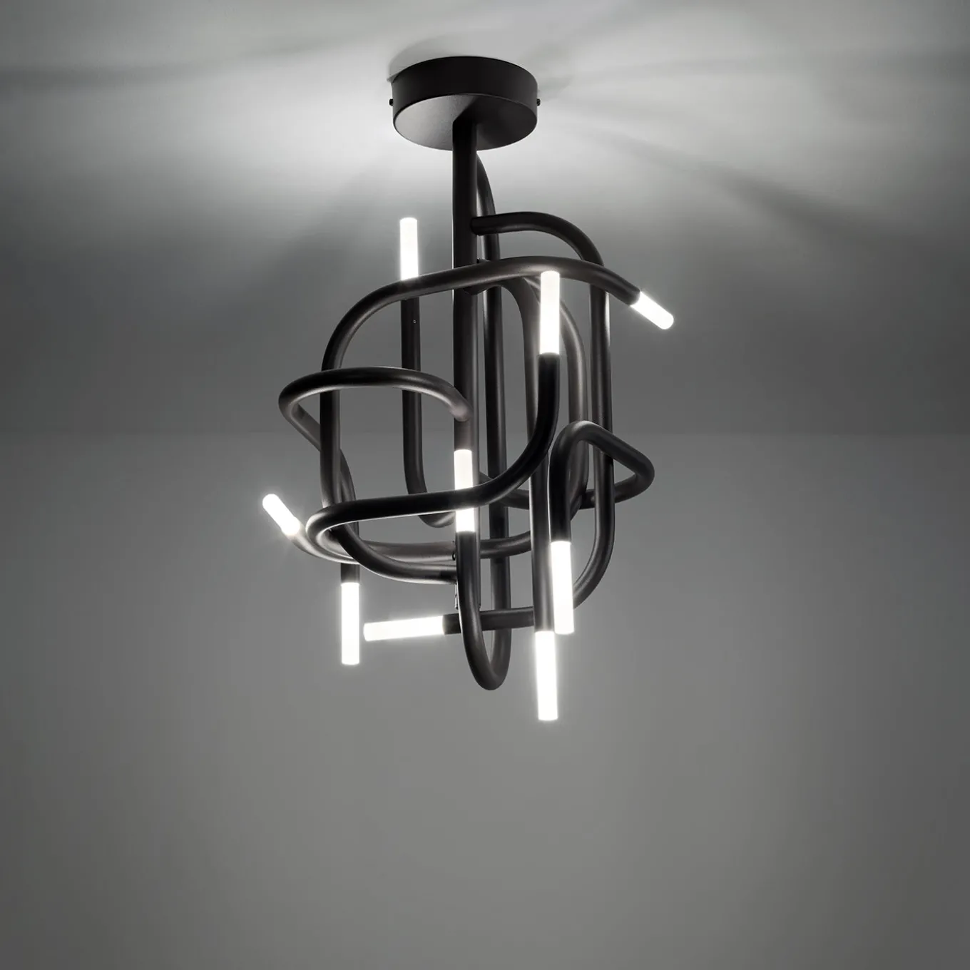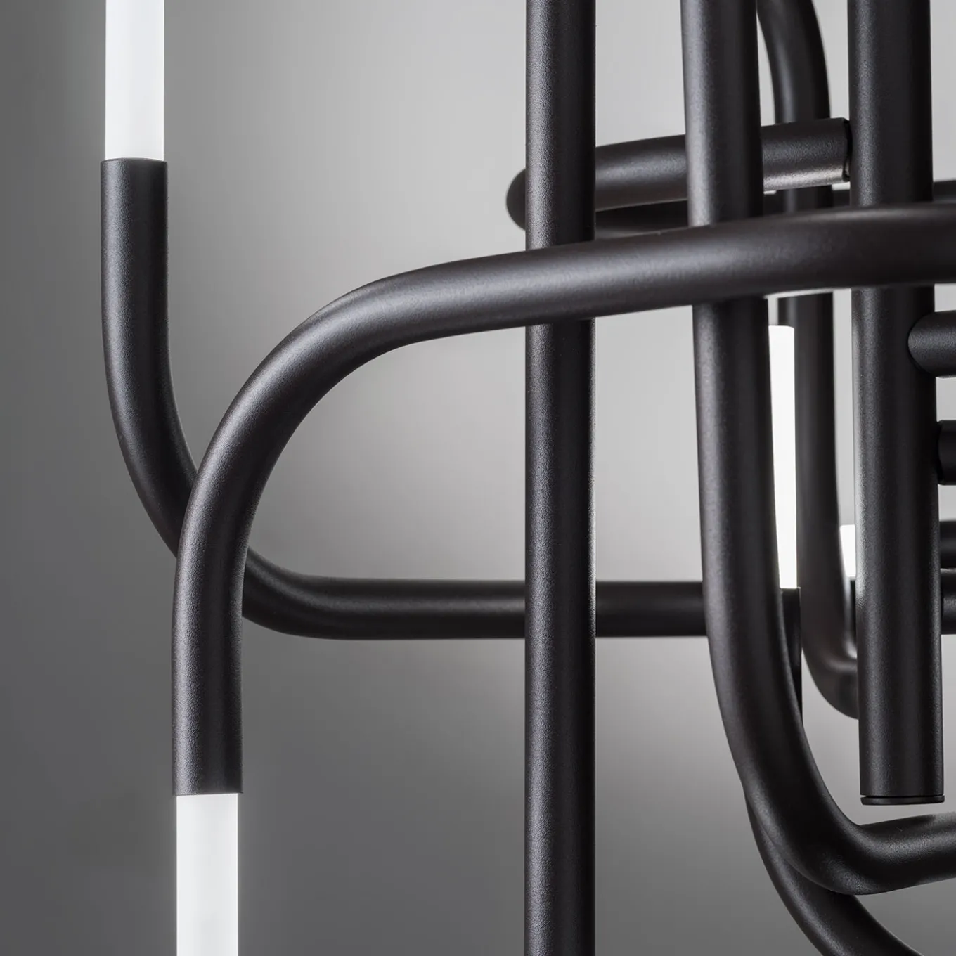 Mangrove Colombia black metal ceiling lamp features an intricate design inspired by the twisted roots of mangrove plants. Its distinctive framework consists of intertwining tubes with uniform connectors combined with illuminated terminals, creating dynamic light patterns and reflections. Designed by Alessandro Masturzo, this piece brings a technical yet organic aesthetic to modern interiors. The lamp’s structure is also available in Colombia painted finish, with a frosted white plexiglass diffuser that softens the light. Please contact the concierge for additional information.