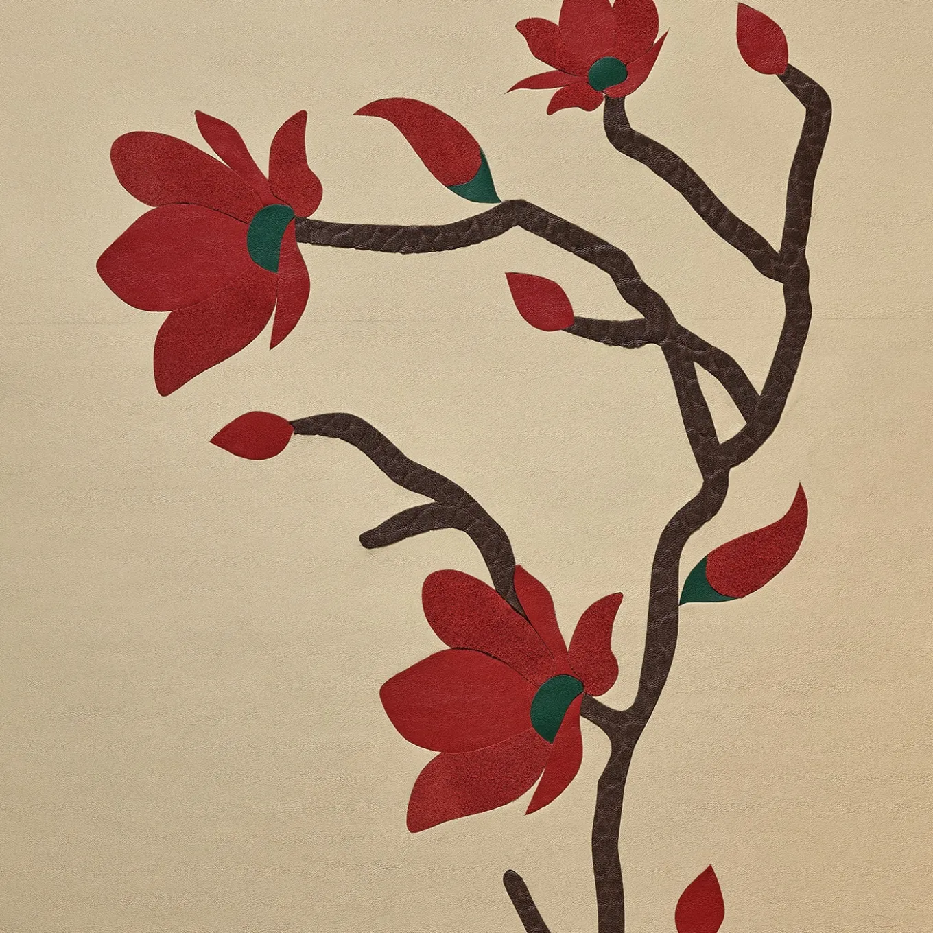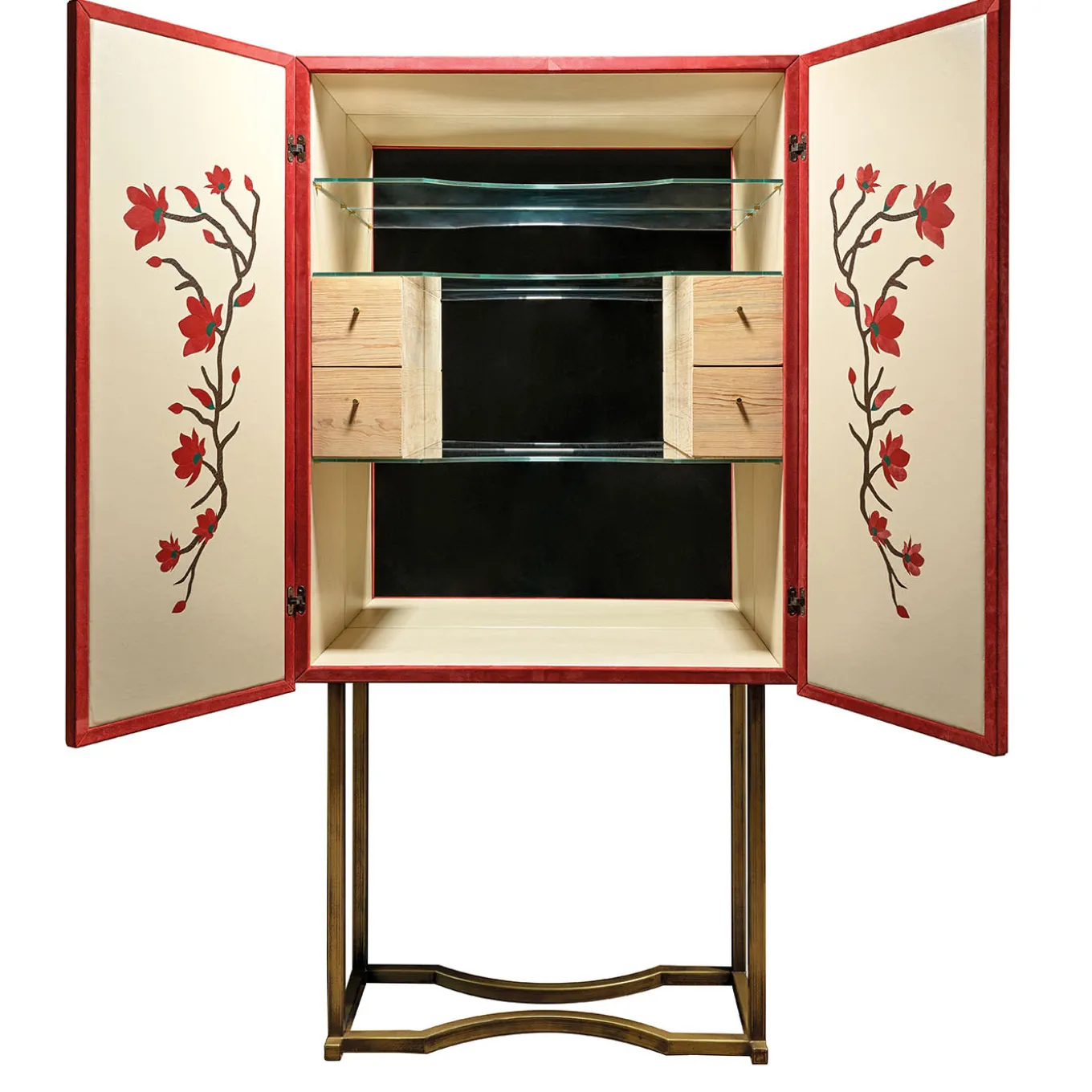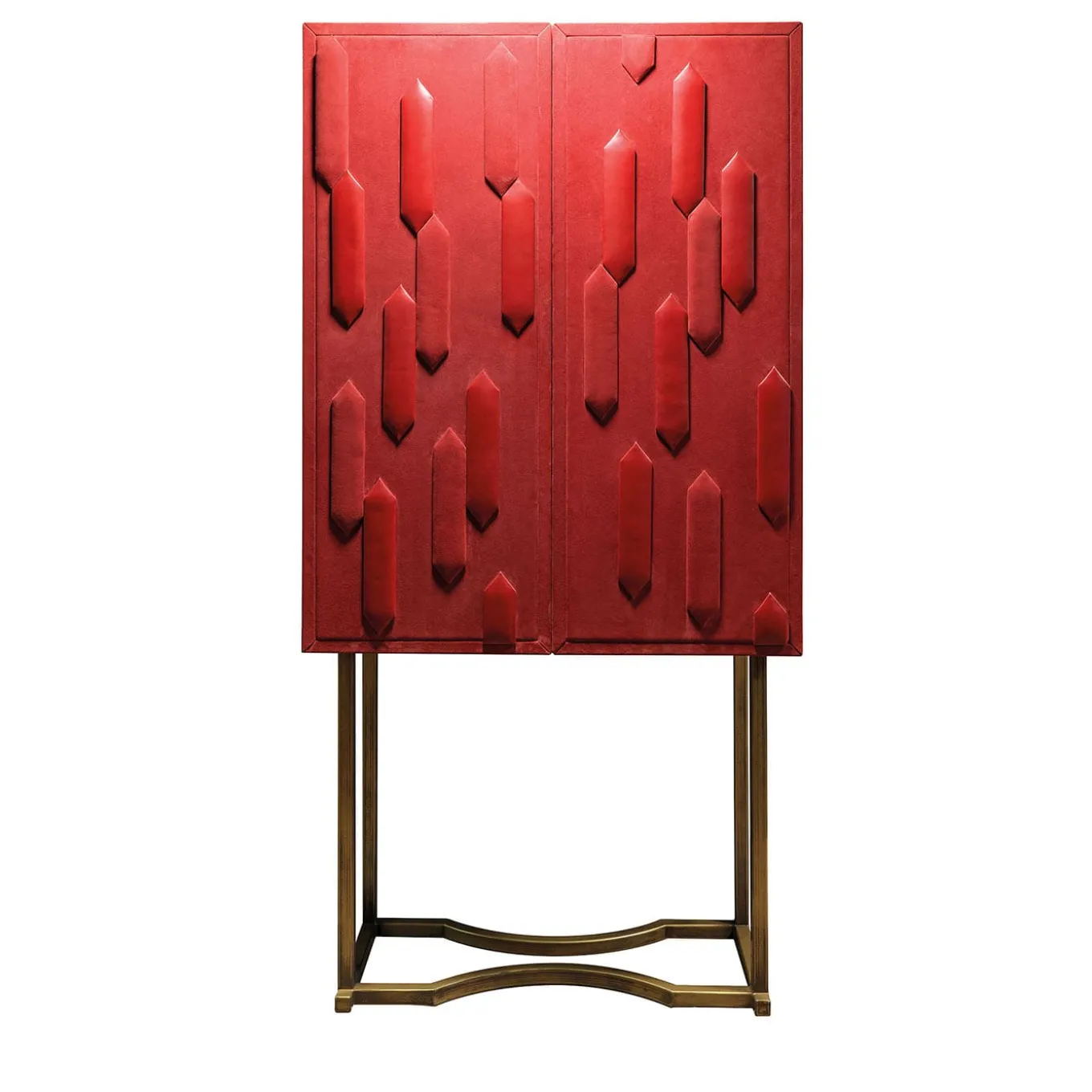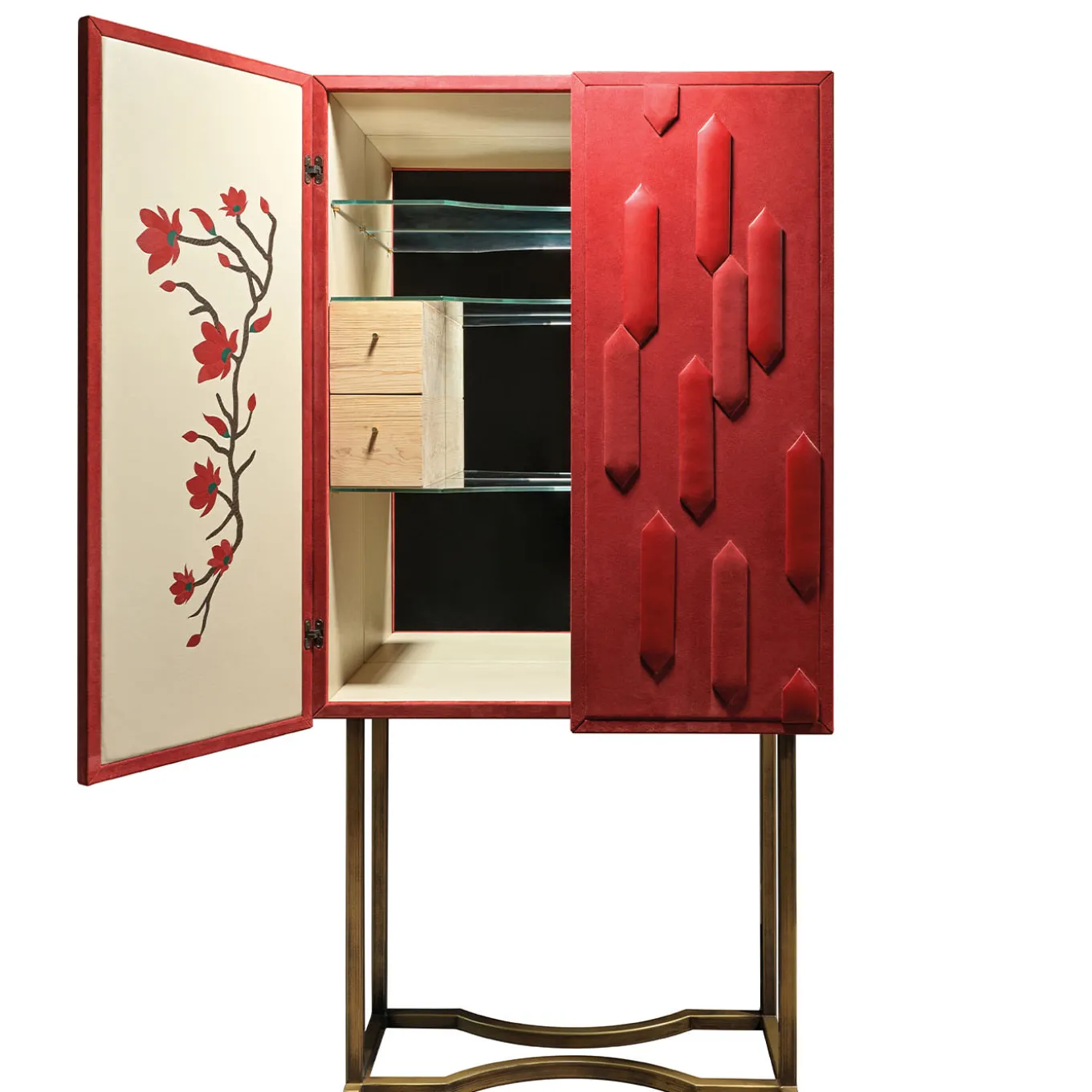 This elegant bar cabinet is a masterpiece of contemporary craftsmanship, blending beauty and functionality. Its doors feature red bovine leather in smooth and suede textures, arranged in a three-dimensional geometric pattern. Inside, a delicate botanical inlay of cherry branches in various leathers adds depth. The interior boasts three glass shelves and wooden drawers, while the hand-painted metal frame with a brushed brass finish enhances its luxury.