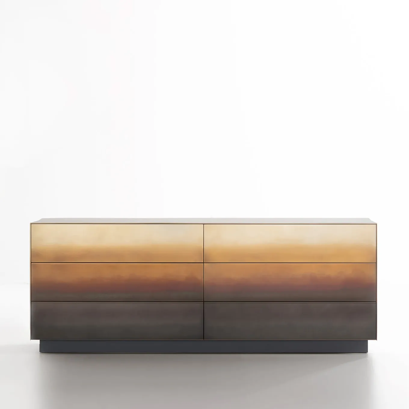 The traces of time are drawn one on top of another, infused into the changing skin of the rigorous metal forms that define these cabinets and chests. Like the tide (marea in Italian) leaves its mark, wave after wave, even here the hand of the craftsman has left its sign, oxidation after oxidation, creating a painterly effect that resembles water’s erosion of the material. Somewhere between design object and work of art, each piece in the collection, composed of a chest of drawers, low credenza and cabinet, is unique thanks to an entirely hand-crafted finish that transforms the metal surface into a delicate watercolour.
