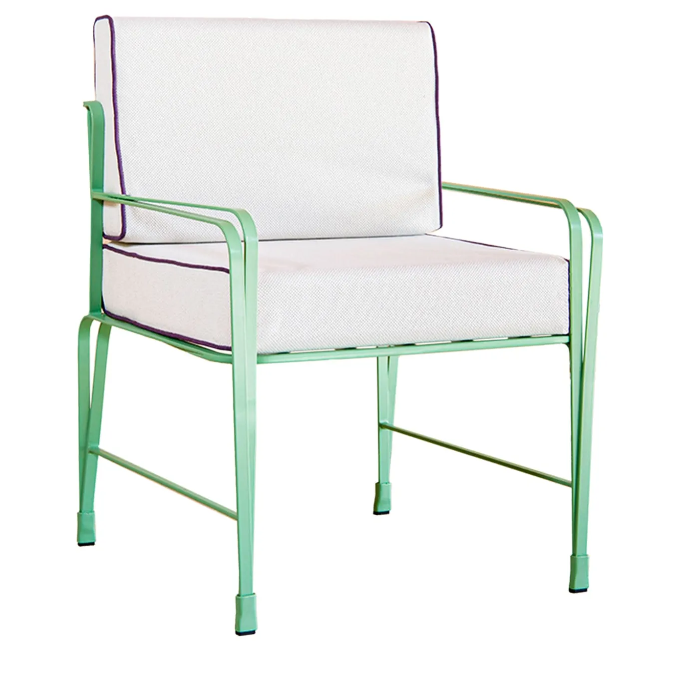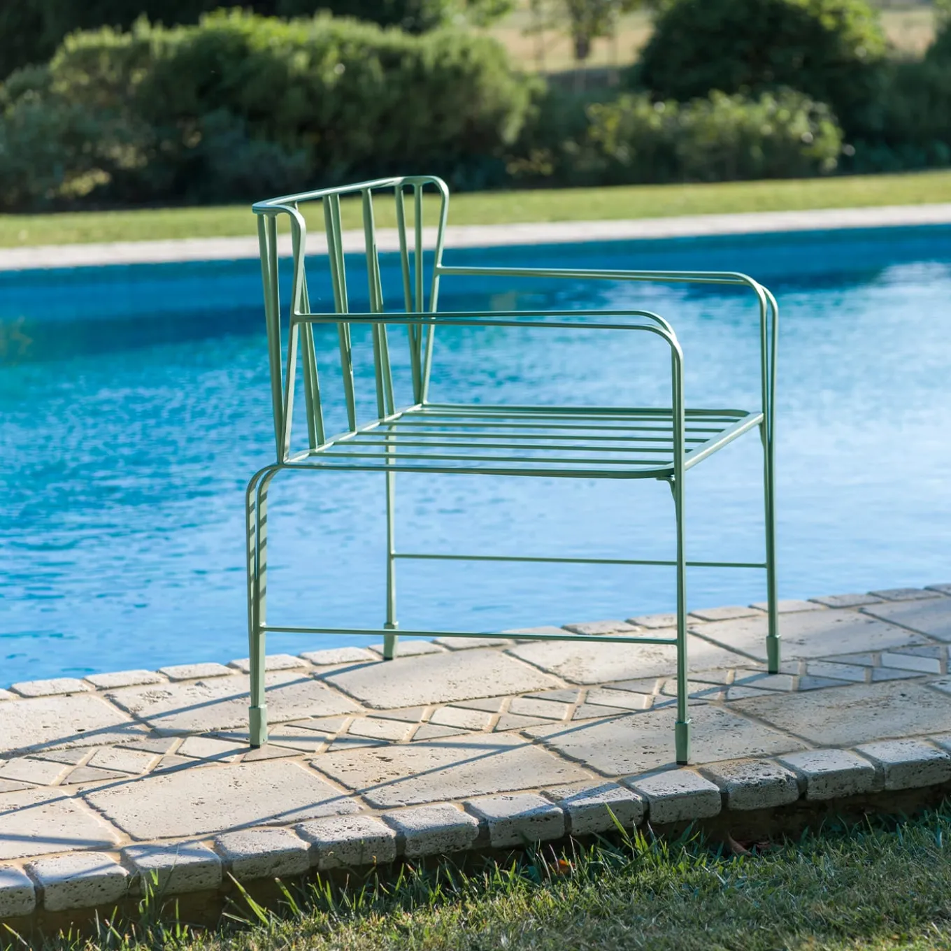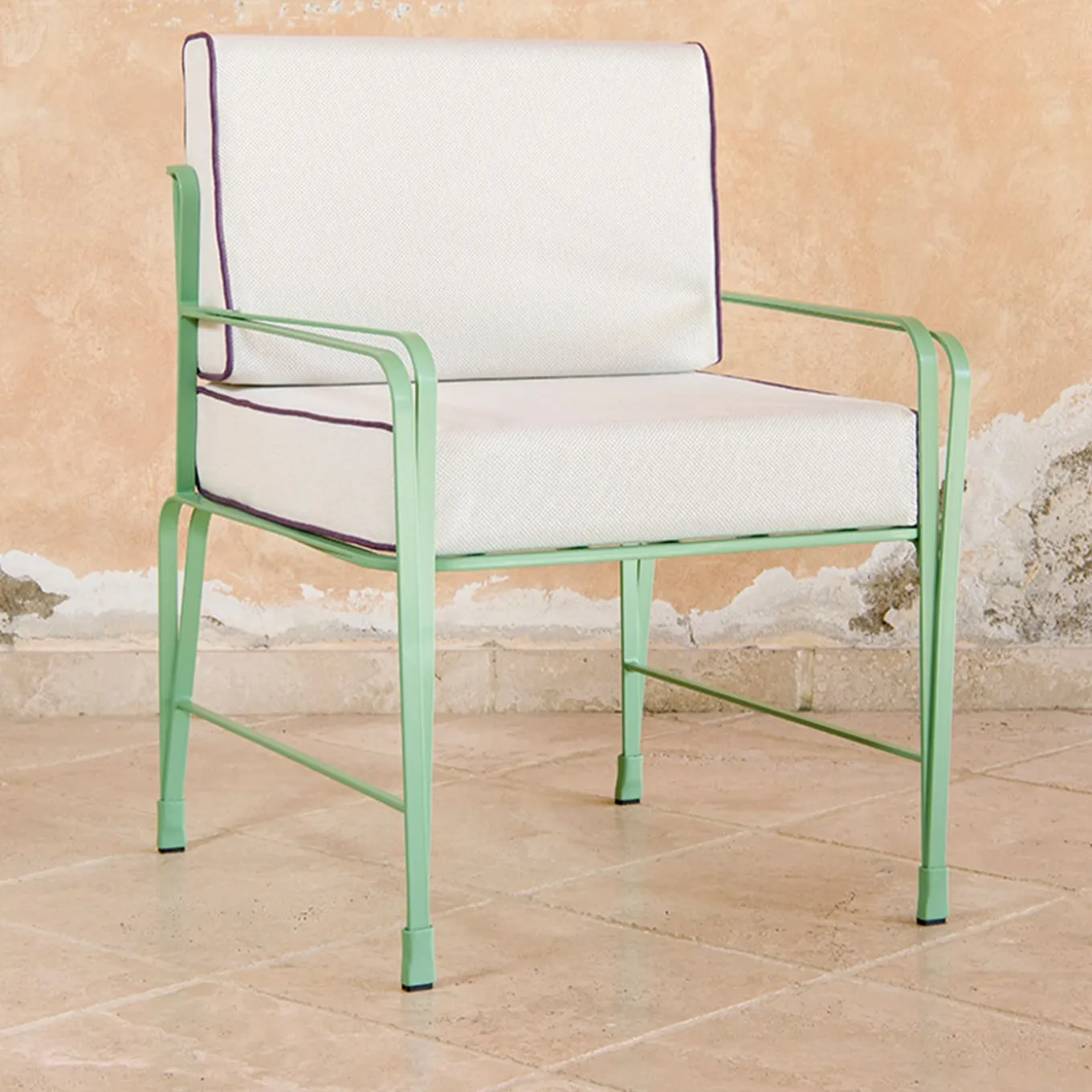 Deftly crafted of forged iron employing ancient Florentine techniques, this elegant armchair will give a distinctive touch of elegance to terraces or patios. Simple cylindrical elements trace the harmonious and timeless profile of the zinc-coated, black-powder-varnished frame and paired with plump padding upholstered with white Sunbrella Nattè Nature fabric. Designed for outdoor use, it is also available with indoor-fitting finishing details.