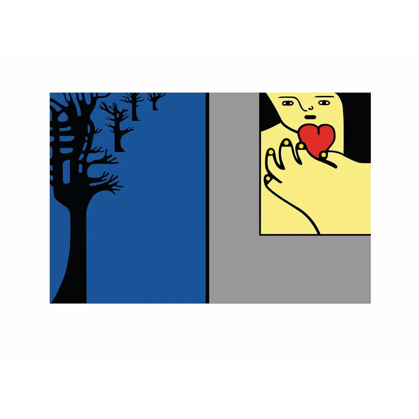 Bare trees progressively retreat into the background, where a woman is depicted holding a bright-red heart between her fingers, this is the poetic image offered by this marvelous print on metal. Part of a limited-edition series of only three pieces, it is among the designs conceived for the Art Therapy mark by fashion designer Elio Fiorucci. A variant printed on silk is also available.