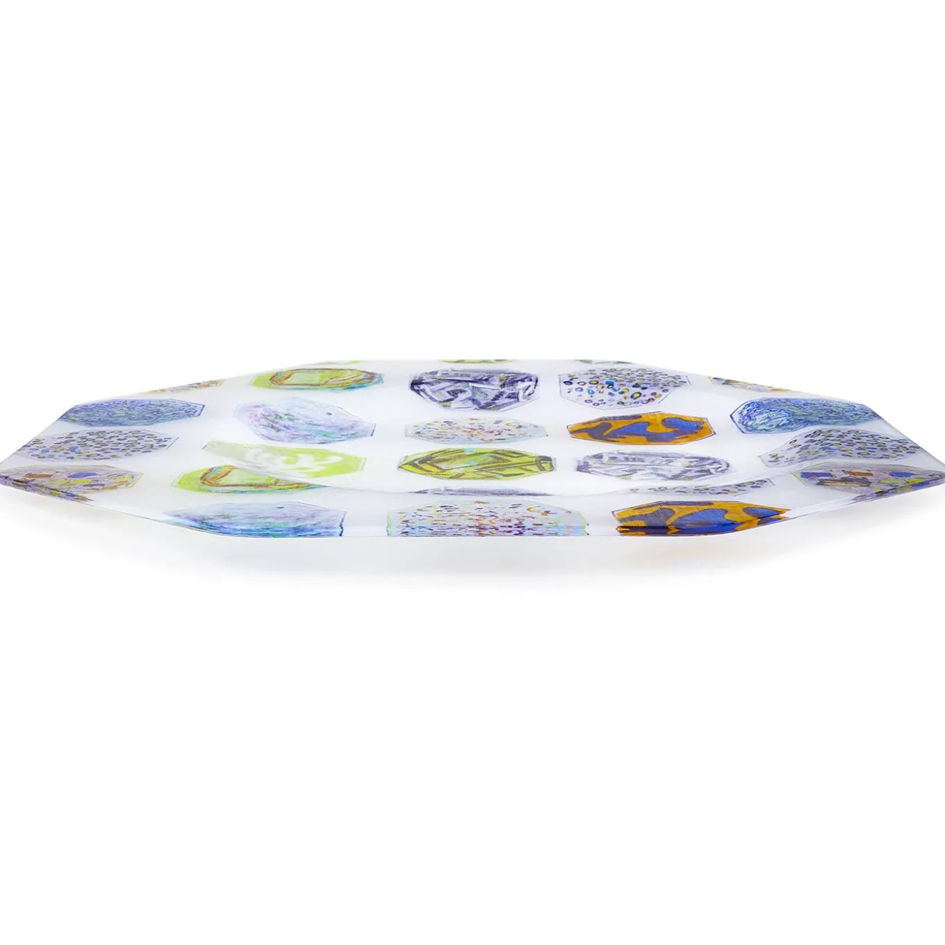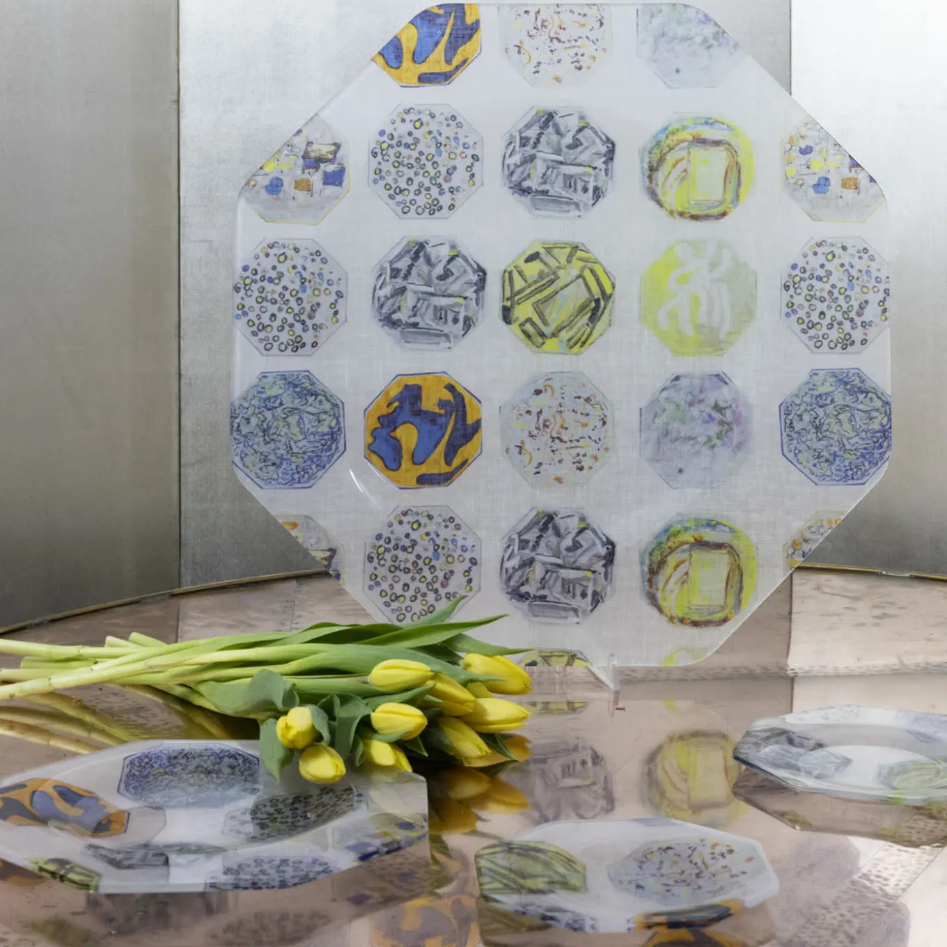 The perfect tray-shape to be held with one hand to be filled with refined finger food. The octagonal shape is asymmetrical with a larger brim for a secure grip. The hollow base is off-center for perfect balance. The crystal-clear material used, methacrylate, is fused together with printed linen, thermo-formed, and finished by hand. Food-certified, impact resistant, dishwasher safe, stackable, handy, and of great impact.
