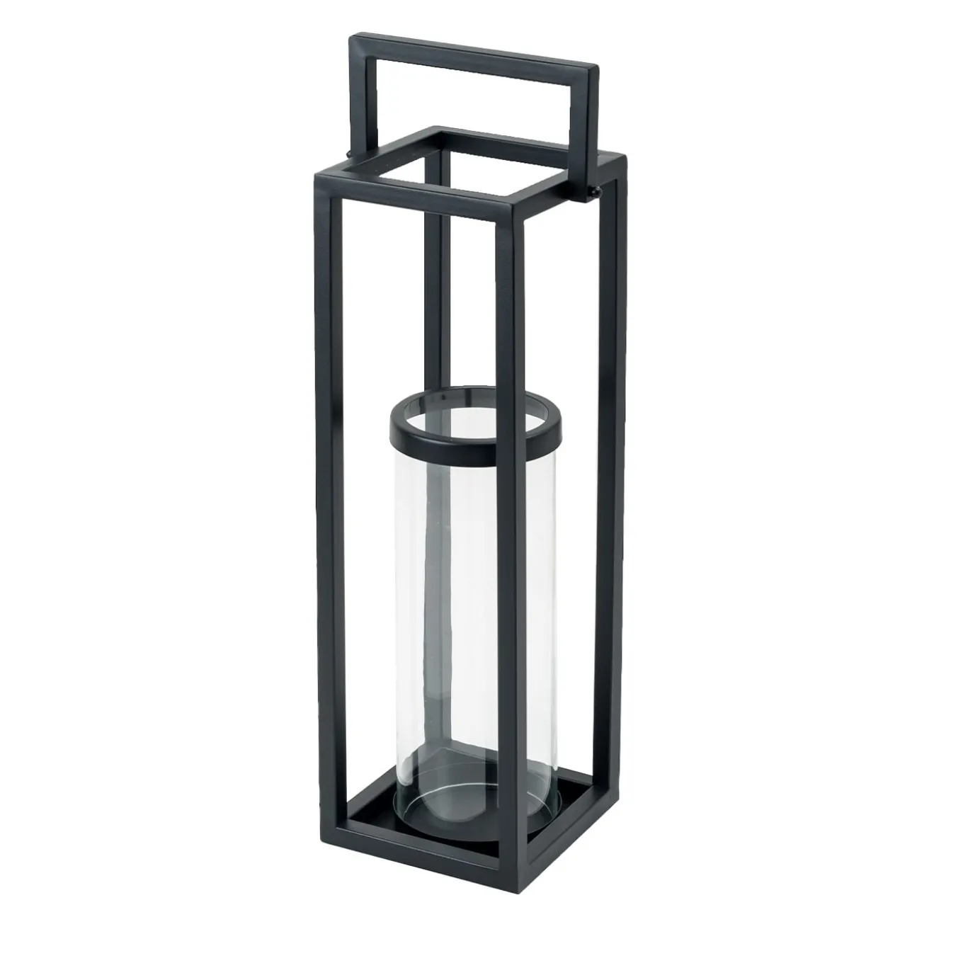 The medium version of a design offered in other two size options for poetic clusters, this floor lantern will infuse any space with a relaxed ambiance. The geometric-cut steel frame comes in an antiqued black finish also shared by the rim and base of the cylindrical glass shade housed within. A bamboo handle variant is also available, please contact the Concierge for customization options.