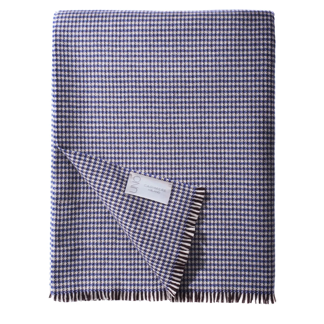 Surprisingly warm and familiar, this superb, large throw – woven on the loom from first-rate cashmere threads – stands out for its understated elegance and superb comfort potential. Result of a careful weaving process, its blue-toned houndstooth design does not affect its smoothness but makes for an enthralling visual impact, further enlivened by the fringed design featured on two of its sides.