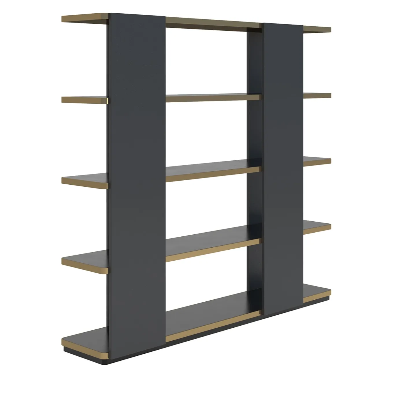 This double-sided bookcase merges prized materials in a fascinating, luxe design perfect to de displayed in modern commercial or residential decors. The wooden frame is upholstered with dark leather and supports the five black-lacquered shelves with rounded edges whose profile is enlivened by golden-finished metal accents.