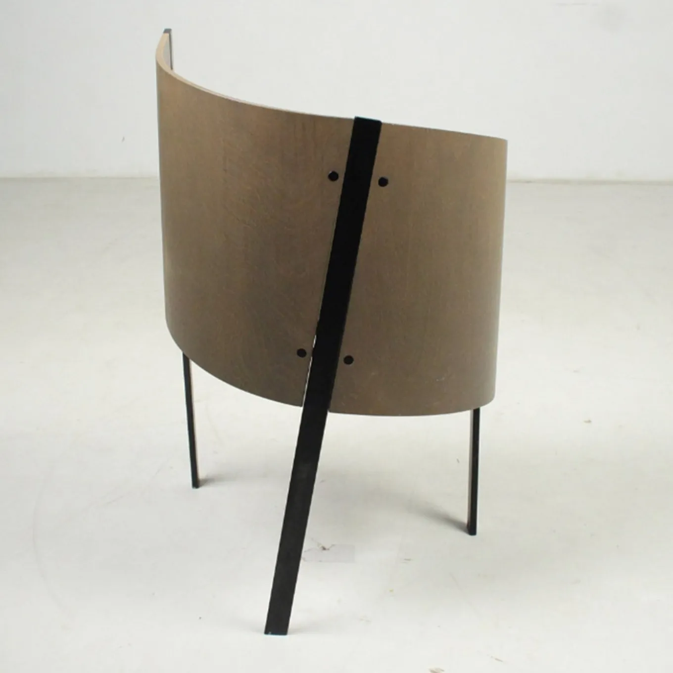 The sleek chair features a sturdy frame made from rectangular-section stainless steel tubing, complemented by a stainless steel sheet seat. The backrest is crafted from curved plywood panels, adding a touch of warmth and elegance to the modern, industrial design. Perfect for contemporary interiors or workspaces.