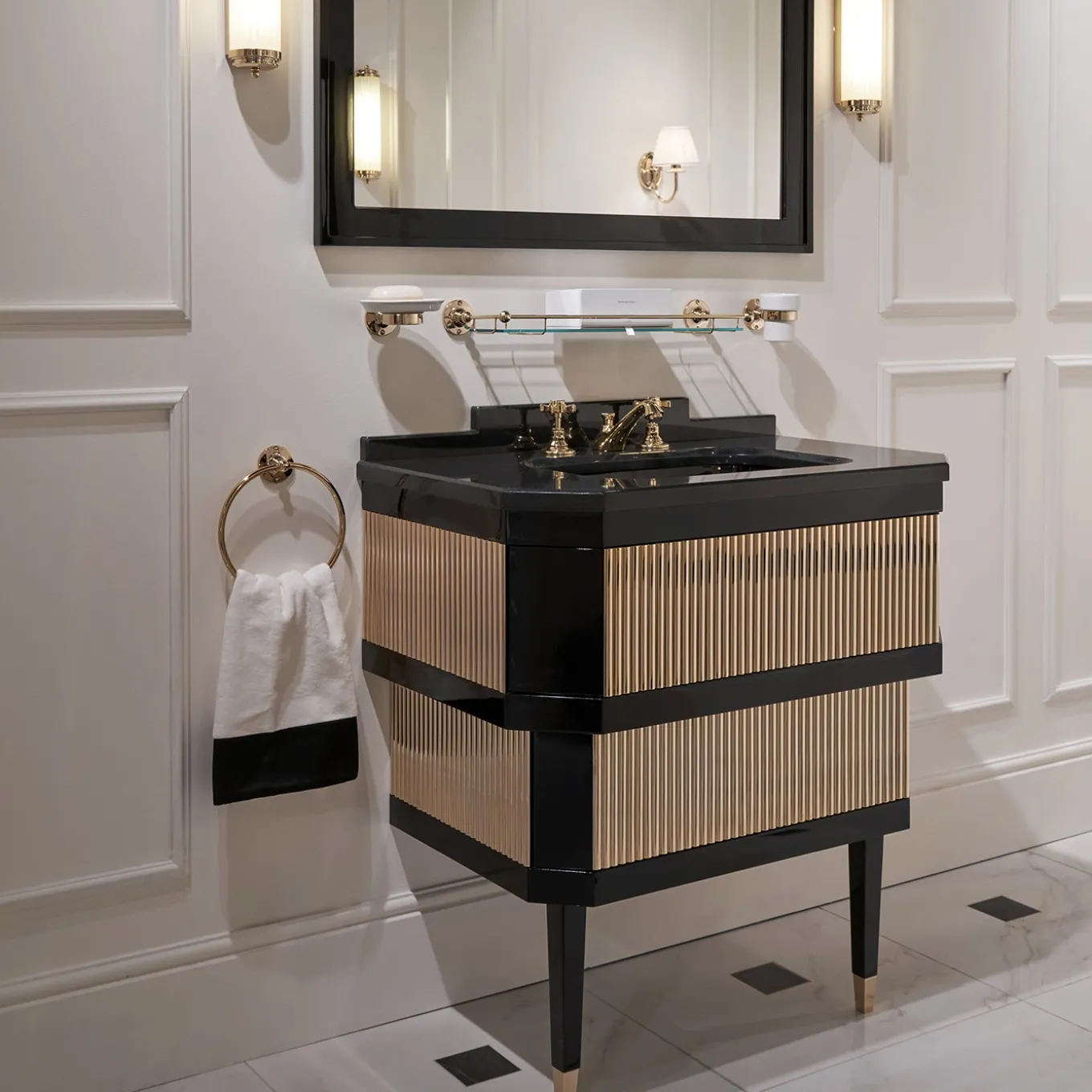 Exquisite raw materials, refined crafting techniques and a unique style that distills and reinterprets in a new way the best of early 20th-century European design make this vanity unit a veritable jewel for the bathroom. The elegant structure in polished lacquered wood supports the Absolute Black Granite marble top and frames the brass slats. Please, contact the Concierge for more options. Faucets are not included.