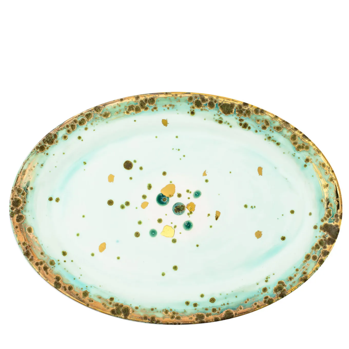 Part of a stunning collection of porcelain dinnerware named after Michelangelo and inspired by the elegant and earthy quality of his work, this oval serving plate is a superb object of functional decor that can be combined with the rest of the series to create a cohesive and unique look on a table or displayed by itself as a decorative centerpiece. Its elegant silhouette is adorned with a gold leaf-adorned rim and boasts a series of yellow and brown spots dotting the pale green and pink background.