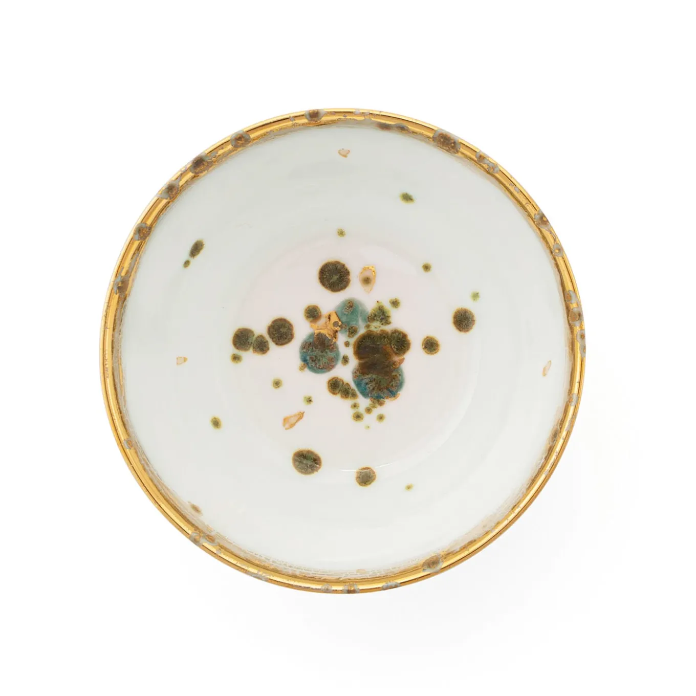 Material and earthy, it conveys classical beauty and elegance thanks to green shades with a light pink center, golden and green punctuation, and broad golden rims. Manufacturing of this product has been realized with hand-crafted procedures and not industrial. Small imperfections, subsidence, and ripples of the surface are deliberately present and they are a feature of the product, proving the hand-made manufacturing procedure.