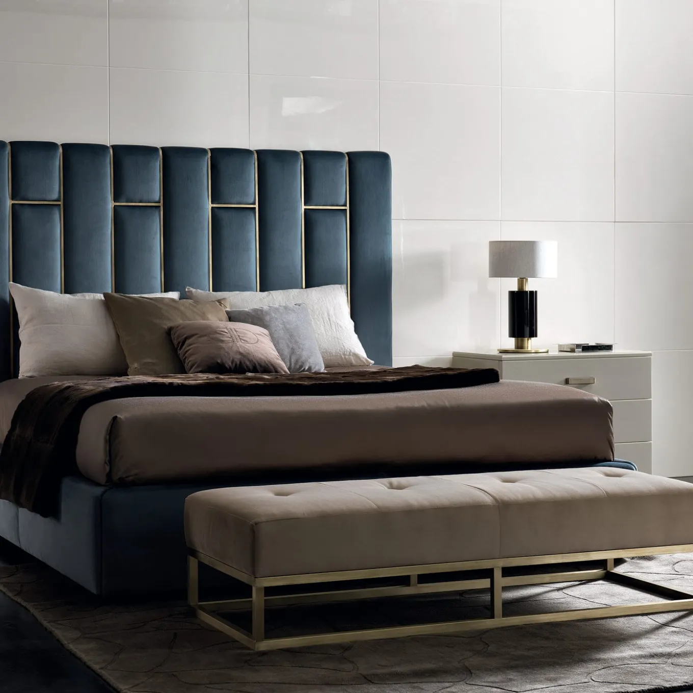 The Milano Bedroom Bench is a stylish and functional accessory for your contemporary style bedroom. Made from plywood and covered with rubber, Air Soft and a layer of goose down, the bench offers optimal comfort. The brass base has a burnished brass finish and the upholstery is available in fabric or leather. Photo features: moonlight camel fabric (CAT A). Contract and commercial certifications available upon request.