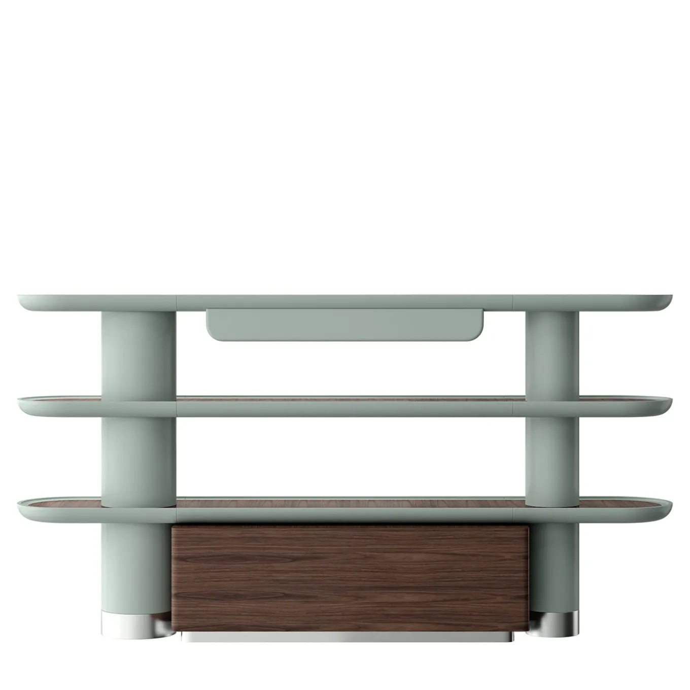 Storage and aesthetic needs are superbly synthesized in this sophisticated bookcase, a wooden design offered in a delicate pastel light-blue hue. Curved extremities lend the three shelves a welcoming feel, their inner wooden finish matching the practical storage unit incorporated at the base. A discreet color-coordinated drawer seamlessly complements the top self, maximizing storage space without renouncing elegance.
