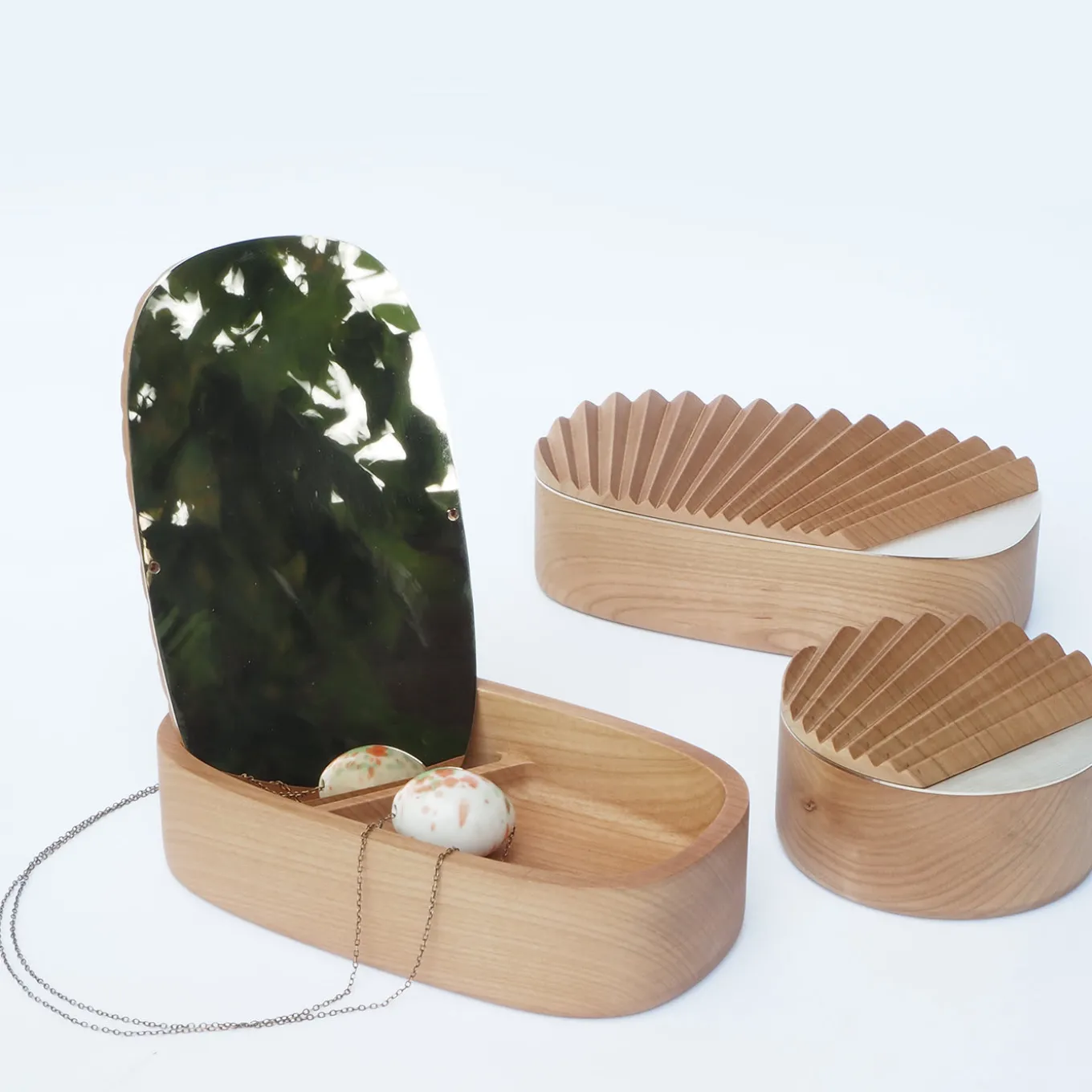 Following Portego’s Self Portrait Mirror, the Mini Portrait Jewelry Box is inspired by the pleating of oriental fans. Made in Italy’s Veneto region, the box is handcrafted in solid cherry wood, with a small mirror and special magnets that allow you to hide away your best pieces. The box measures 10 centimeters in diameter.