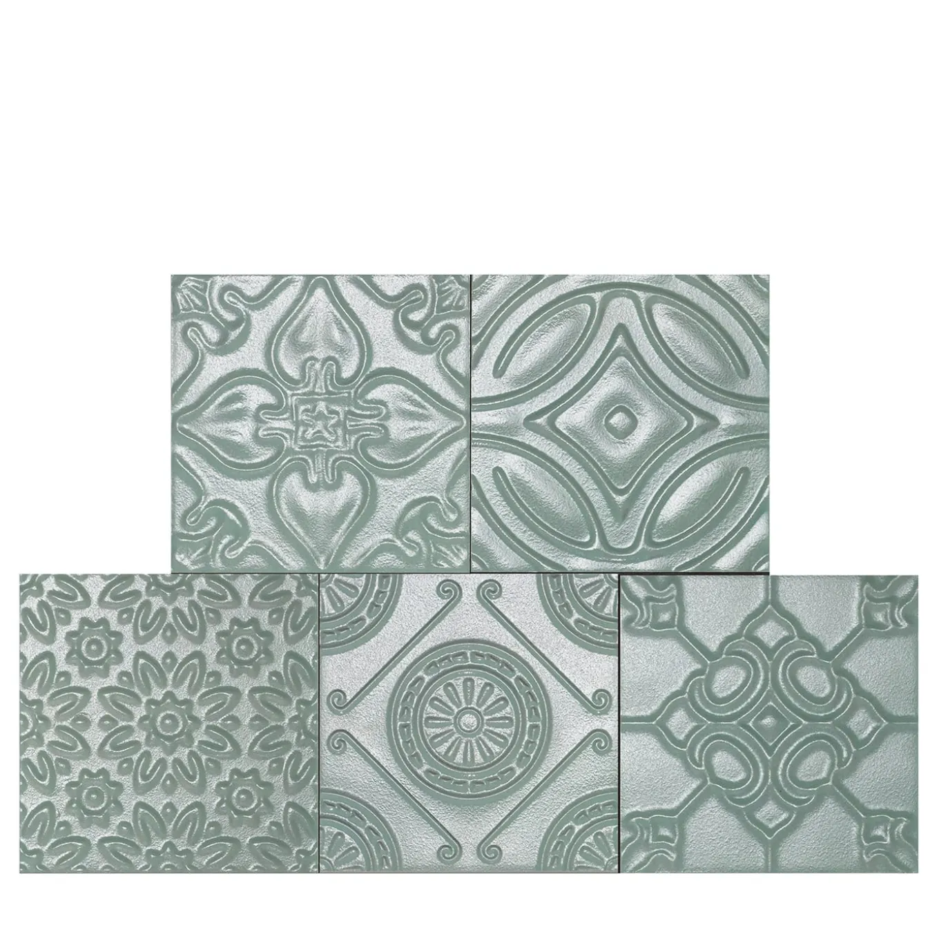 This set of 24 square tiles in fine ceramic will adorn the walls of sophisticated homes while evoking soothing fields and their characteristic hue. An assortment of five different raised patterns lends them their characteristic tactile and visual quality that can be organized as desired. Please consult the Artemest catalog for additional color options for diverse tile compositions.