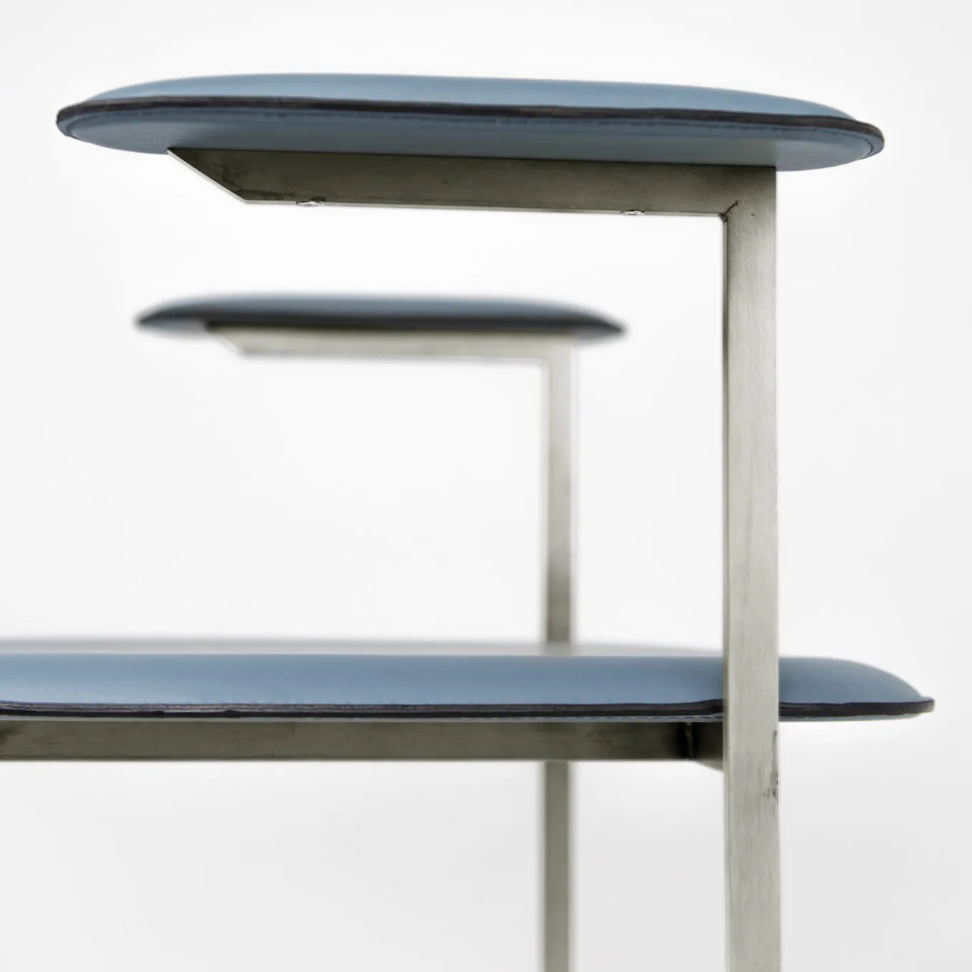 The geometric lines of this exquisite chair make this a timeless piece. The handmade structure in iron and steel has a protective finish and its pieces have been bent and welded together. The seat, armrests, and back have fine polyurethane cushions covered in natural leather in a soft turquoise hue. The back spherical handle is in wood.