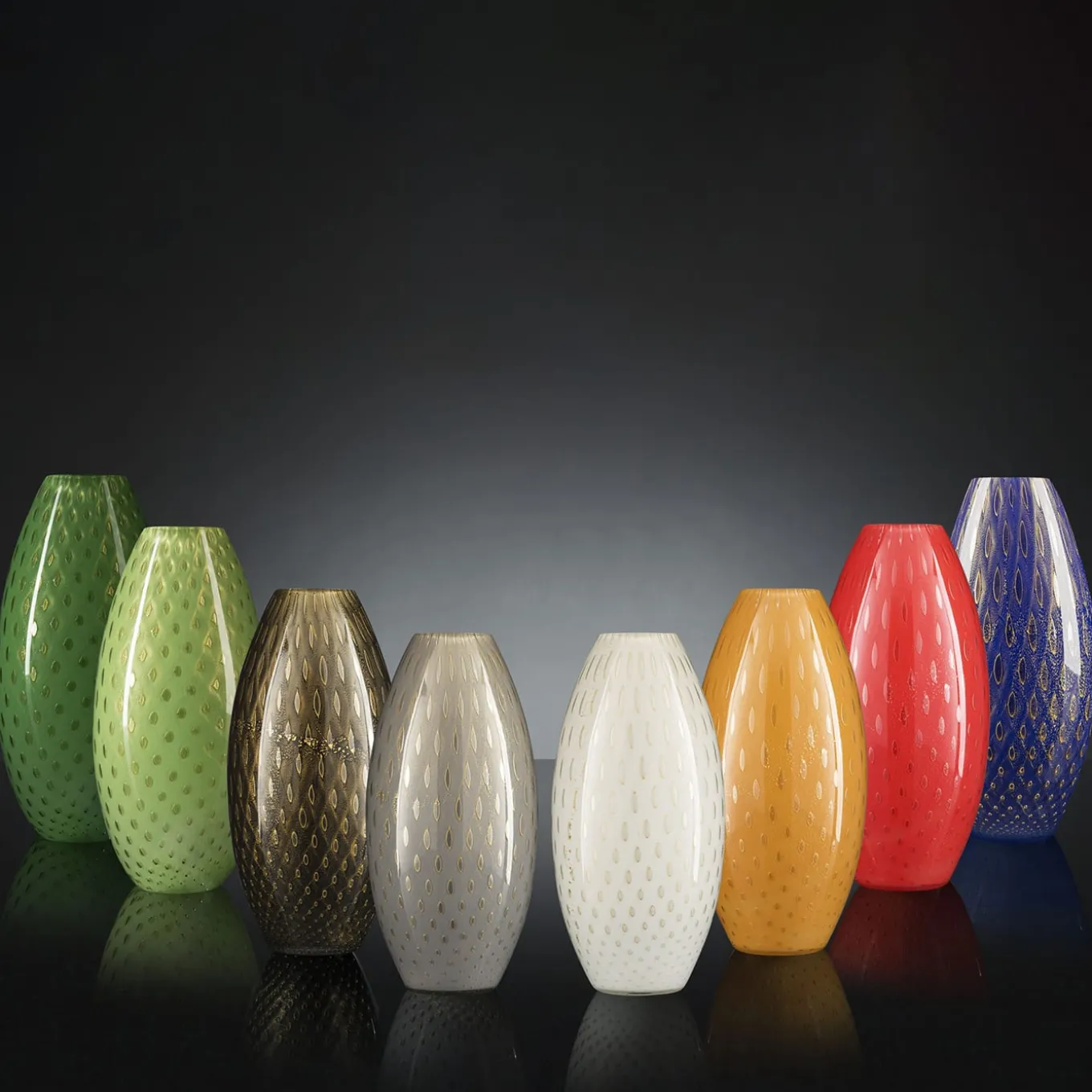 Offered in a bright orange hue reminiscent of juicy blonde oranges, this vase will infuse any domestic or hospitality decor with liveliness and elegance. A motif of shimmering golden drops is trapped within the vase’s bulging body, achieved by mouth-blowing prized Murano glass. Please browse the Artemest catalog for more color versions.