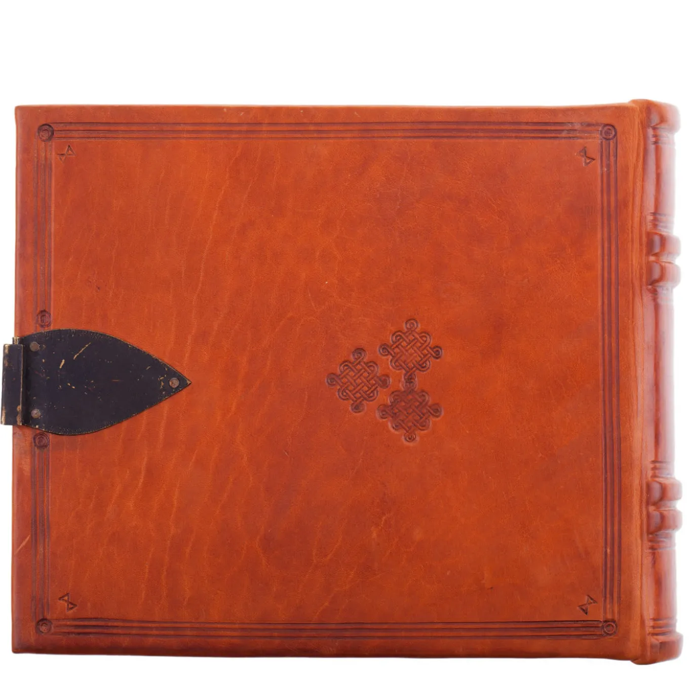 This book by Florentine bookbinder Giannini is bound in a monastic style, with leather dyed using the ancient technique of vegetable tanning and a handmade brass clasp. The hand-sewn interior contains ivory paper and uniquely-crafted marbled endpaper.