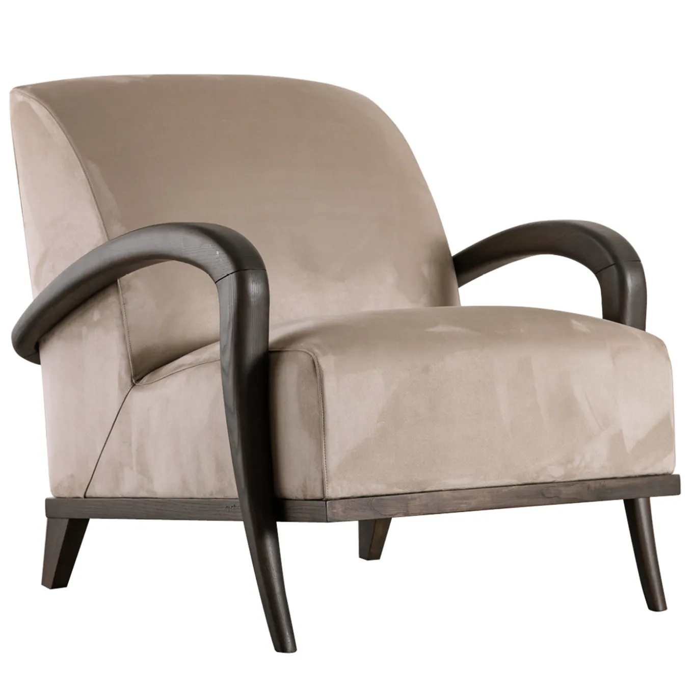 Characterized by its gracefully arching armrests, the Moon lounge chair is crafted in ash wood, available in eight different natural finishes, shown here in Sigaro. The chair is then upholstered with the fabric of your choosing, shown here in silk-colored faux nubuck leather. The chair boasts a patented design, authentic wood guaranteed.