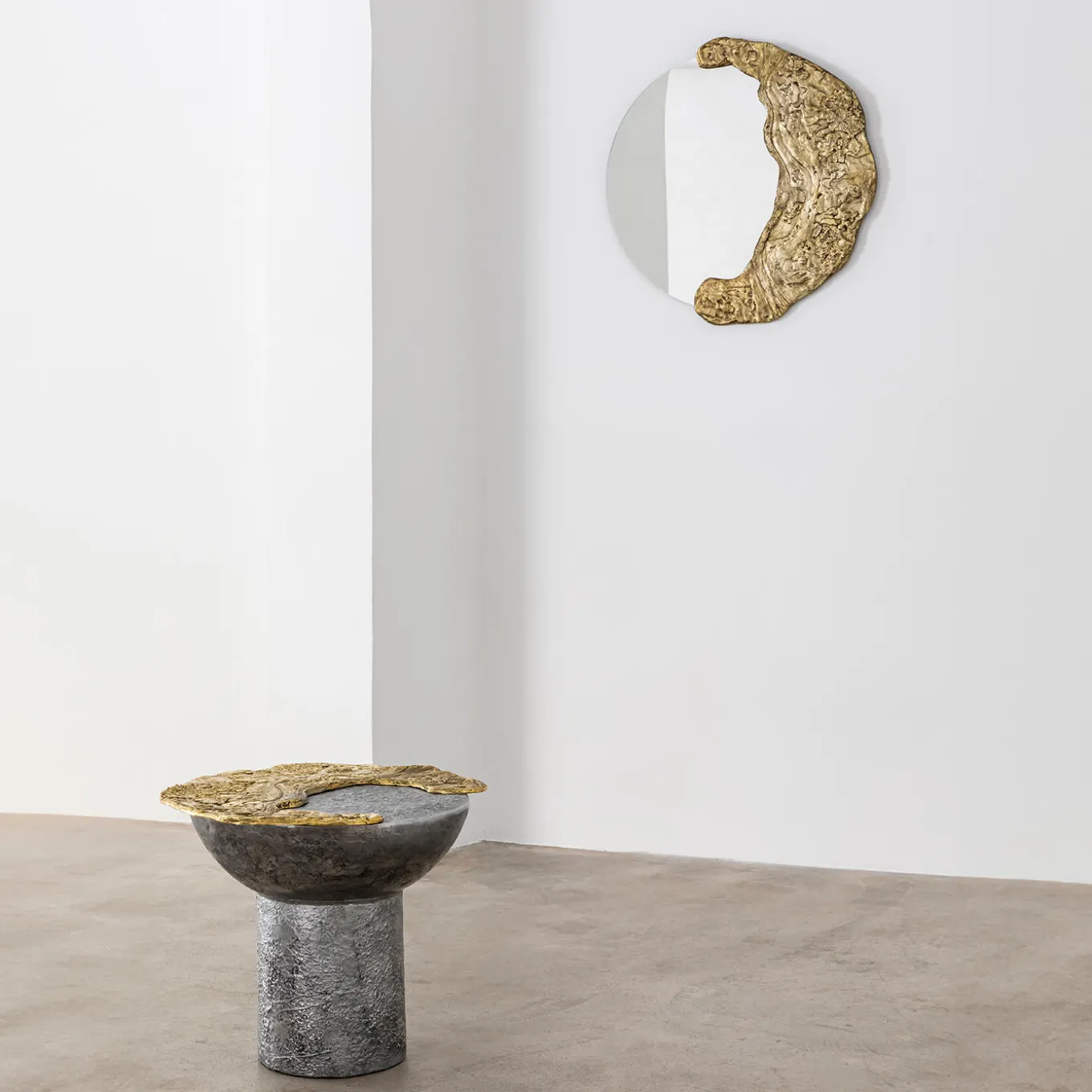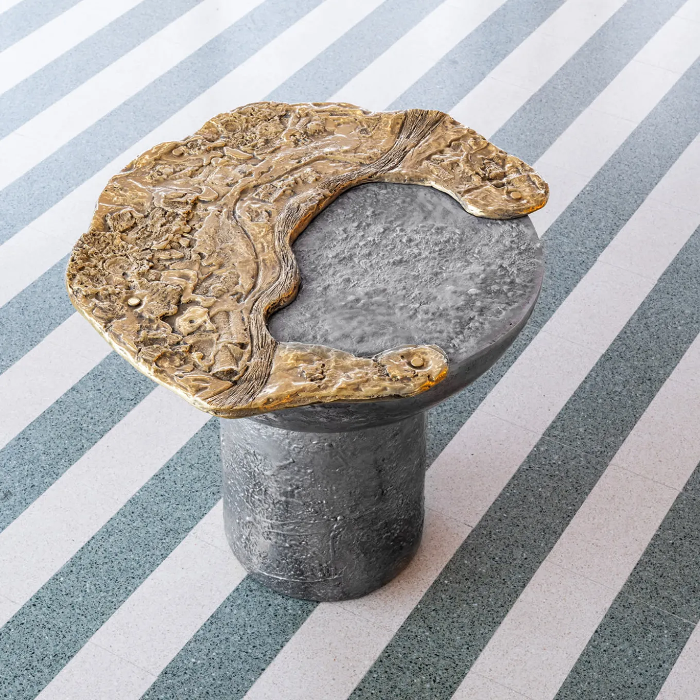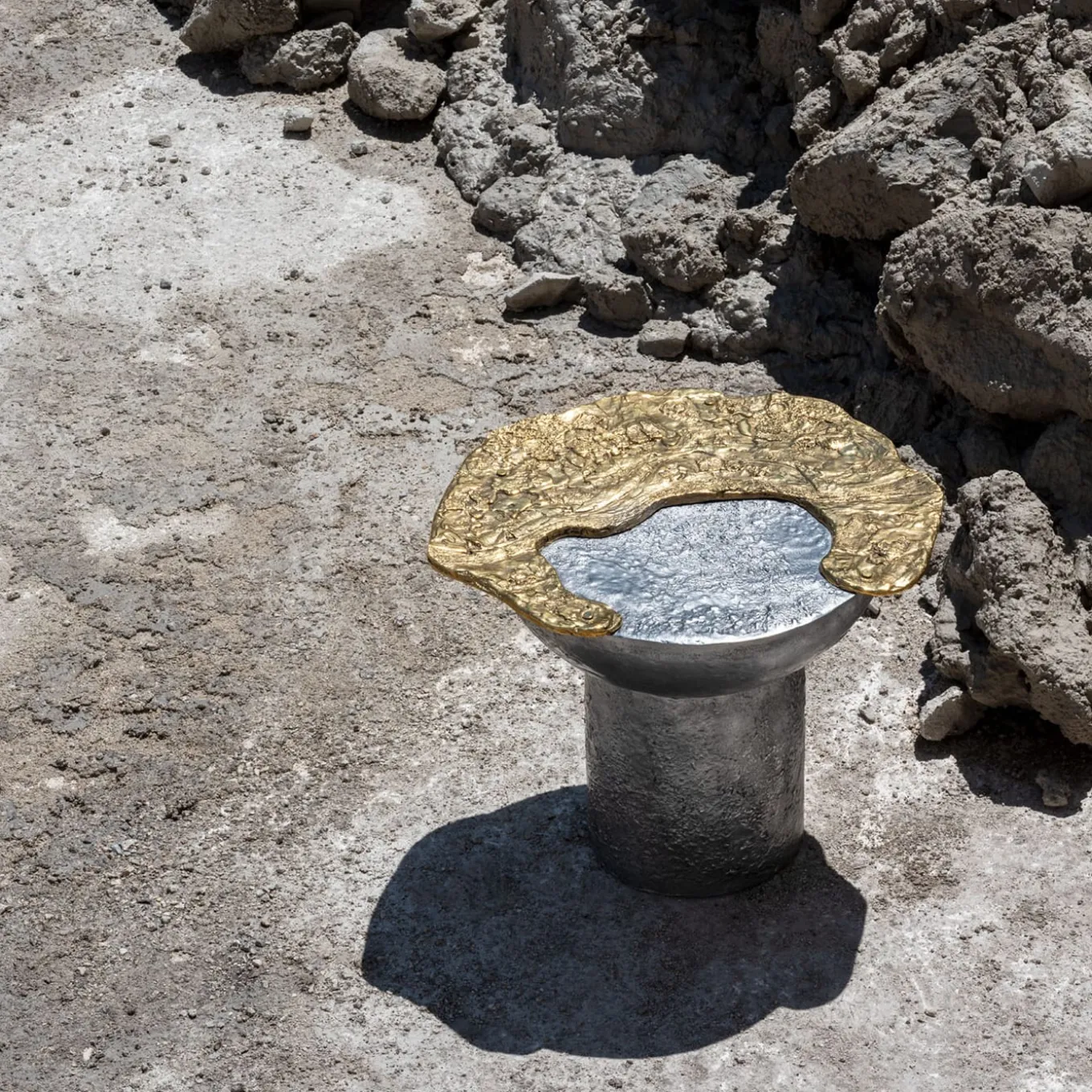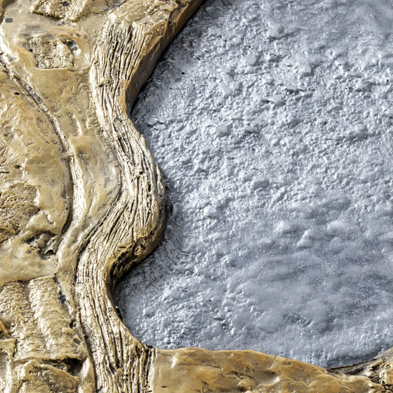 Crafted from 80% recycled aluminum and bronze via lost-wax casting, the Mooncrater table is a testament to life’s origin—a textured landscape formed by debris and residues. Handmade in Italy, customizable in dimensions, it adds a dynamic touch to interiors. Wanderart metal-cast artworks are all hand made, therefore dimensions and weight may vary. Represented by Marion Friedmann gallery.