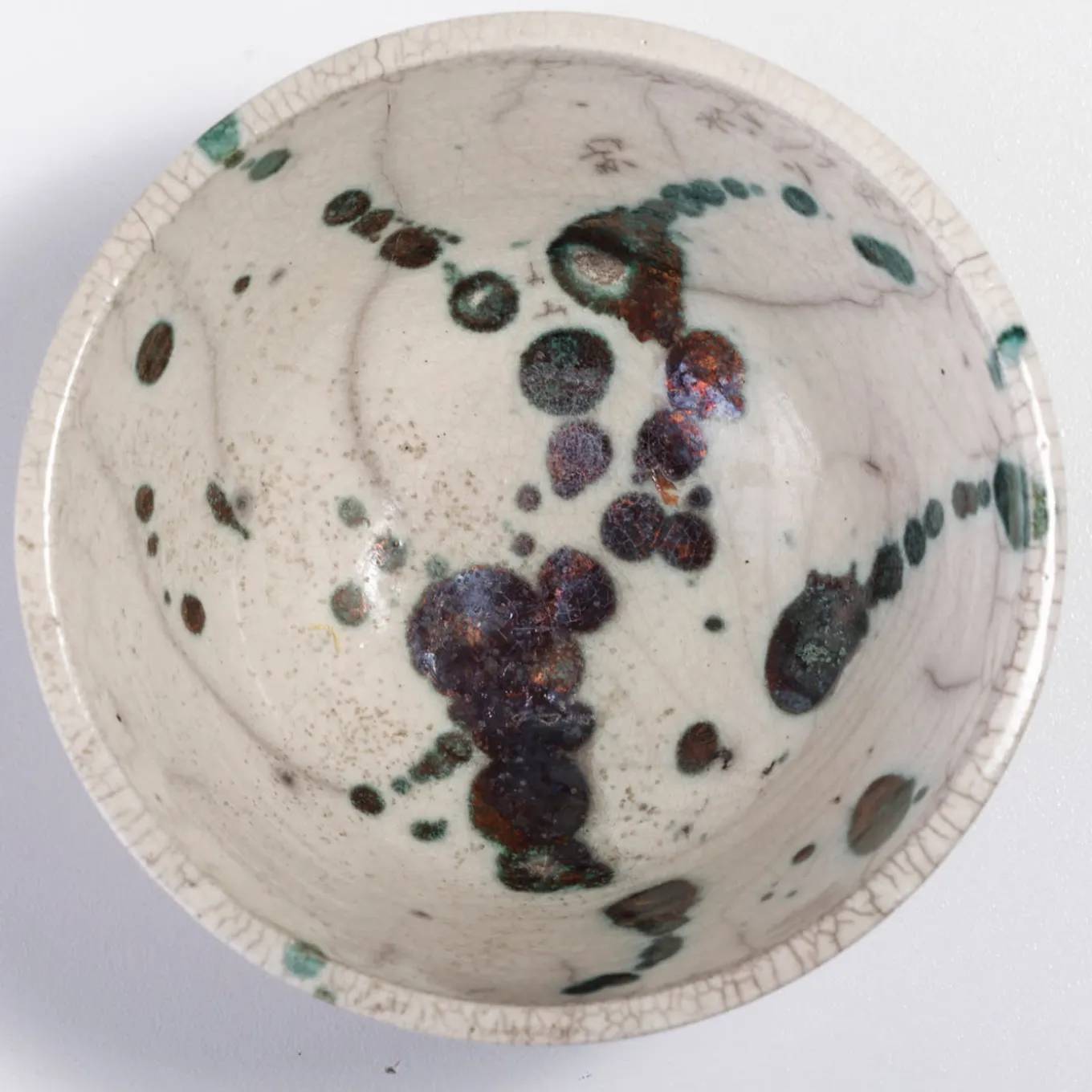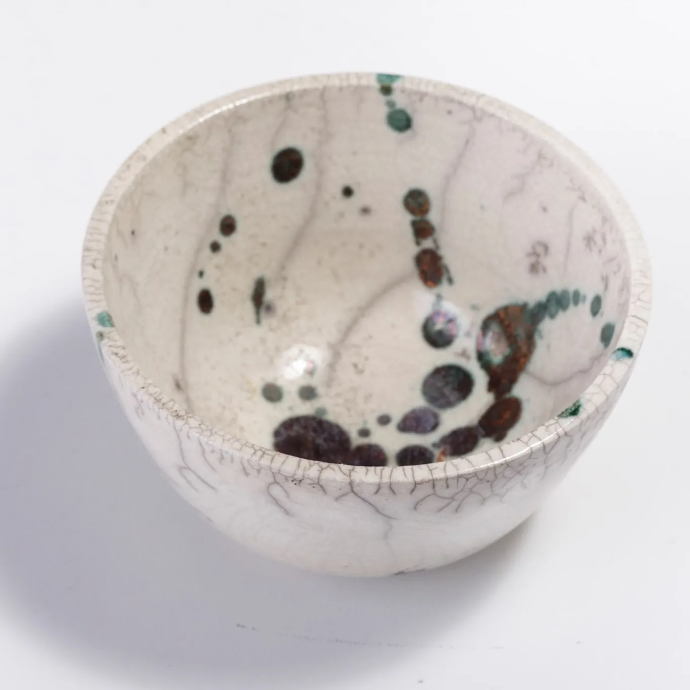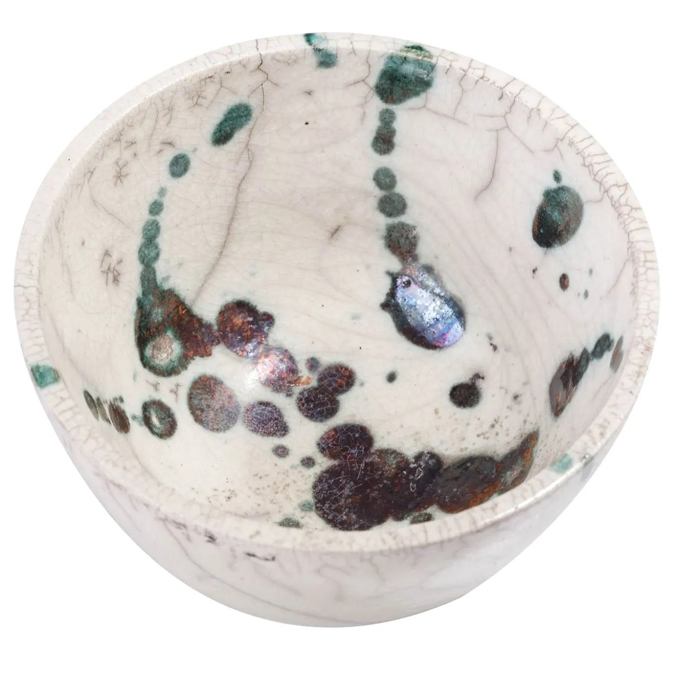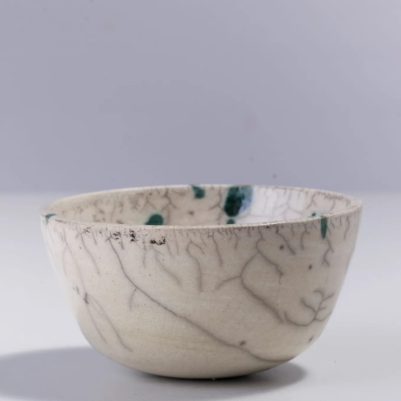 A visually impressive yet soft play of shades describes the mesmerizing flair of this spectacular bowl, marked by a natural white color enriched with rusty green spots and a gray patchwork. A unique objet d’art, it is handcrafted of ceramic following the Japanese technique of naked Raku firing, which makes each piece a one-of-a-kind design of unprecedented charm.
