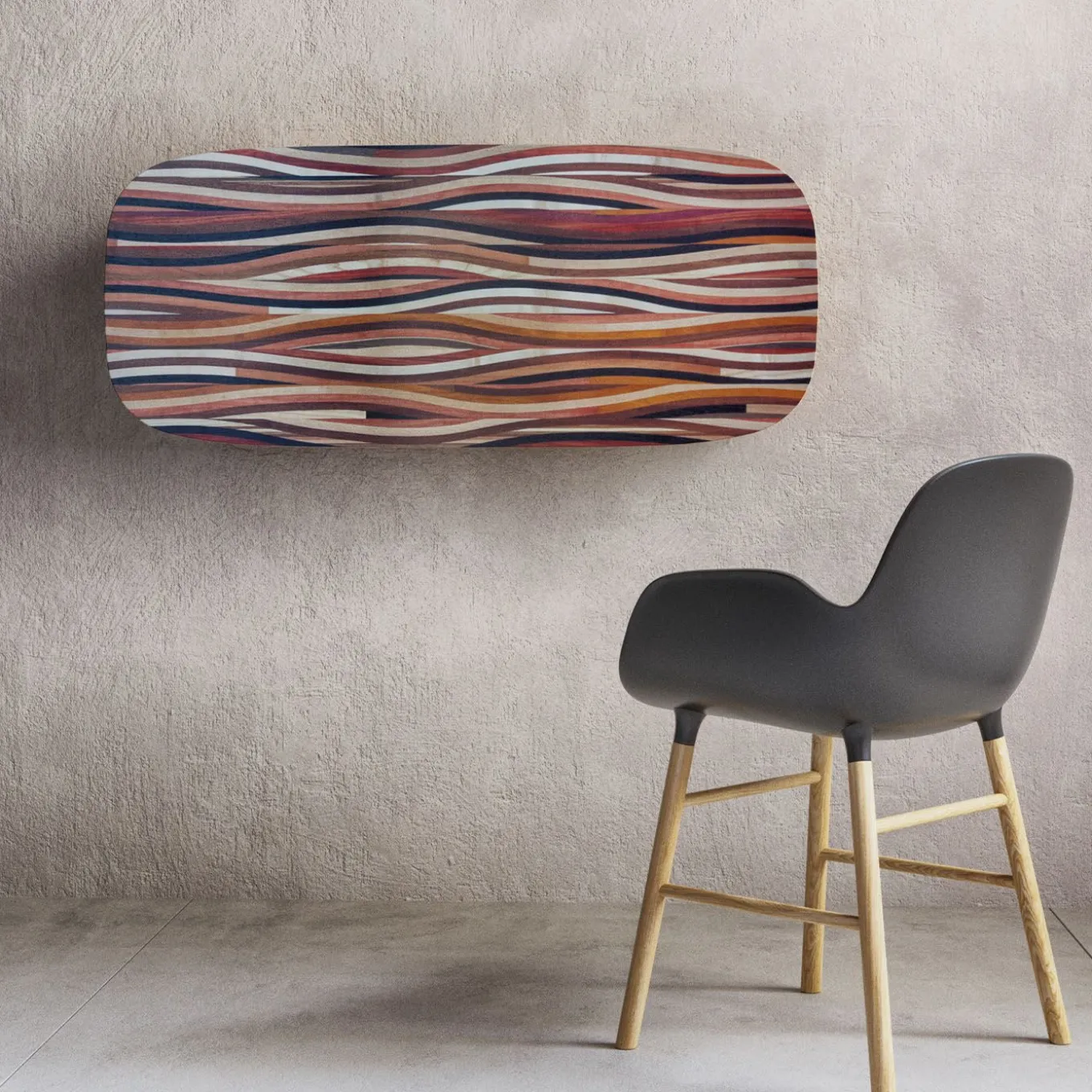 This stunning wall-suspended desk is both functional and strikingly decorative. A flap opens to the interior and can be used as a display shelf or to work on a computer, with the back equipped with a compartment for a variety of objects. The flap’s front panel is adorned with an exclusive combination of reclaimed wood created by Ferrantelli Falegnameria, in which the pieces are braided and made into a one-of-a-kind decorative surface. When opened, the piece has a total depth of 65 cm. Other dimensions and types of wood can be requested by consulting the Concierge.