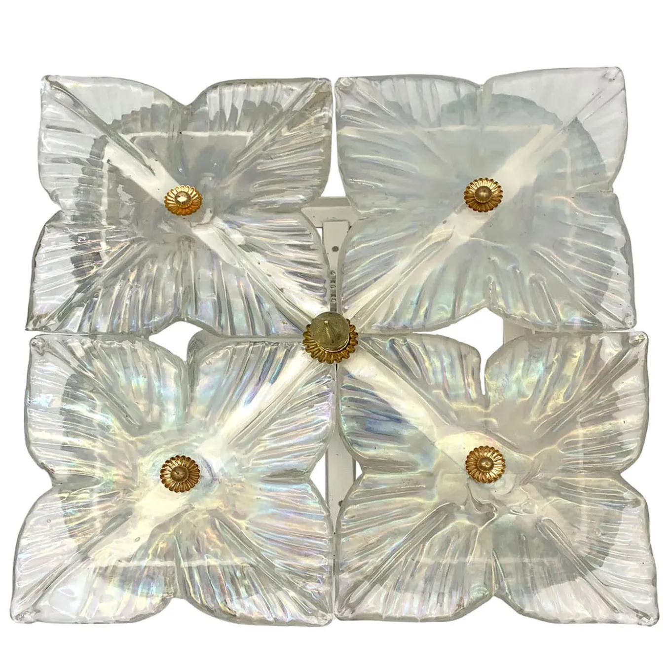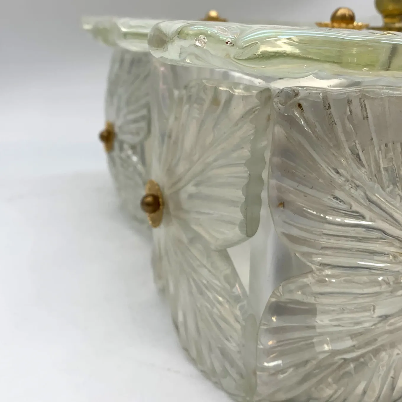 This exquisite Murano Flower Wall Light showcases a stunning fusion of artistry and illumination. Crafted from rare glass, the light features a captivating floral design that enhances any space. The transparent and acid-etched glass petals radiate elegance, making it not just a light fixture but a potential museum-quality piece. Designed for versatility, this luminaire can be installed as either a ceiling-mounted fixture or a wall sconce, accommodating various interior aesthetics. It is equipped with three E27 bulb sockets, ideally suited for LED lighting, ensuring both functionality and energy efficiency. The original brass accents add a touch of warmth, harmonizing beautifully with the glass elements.