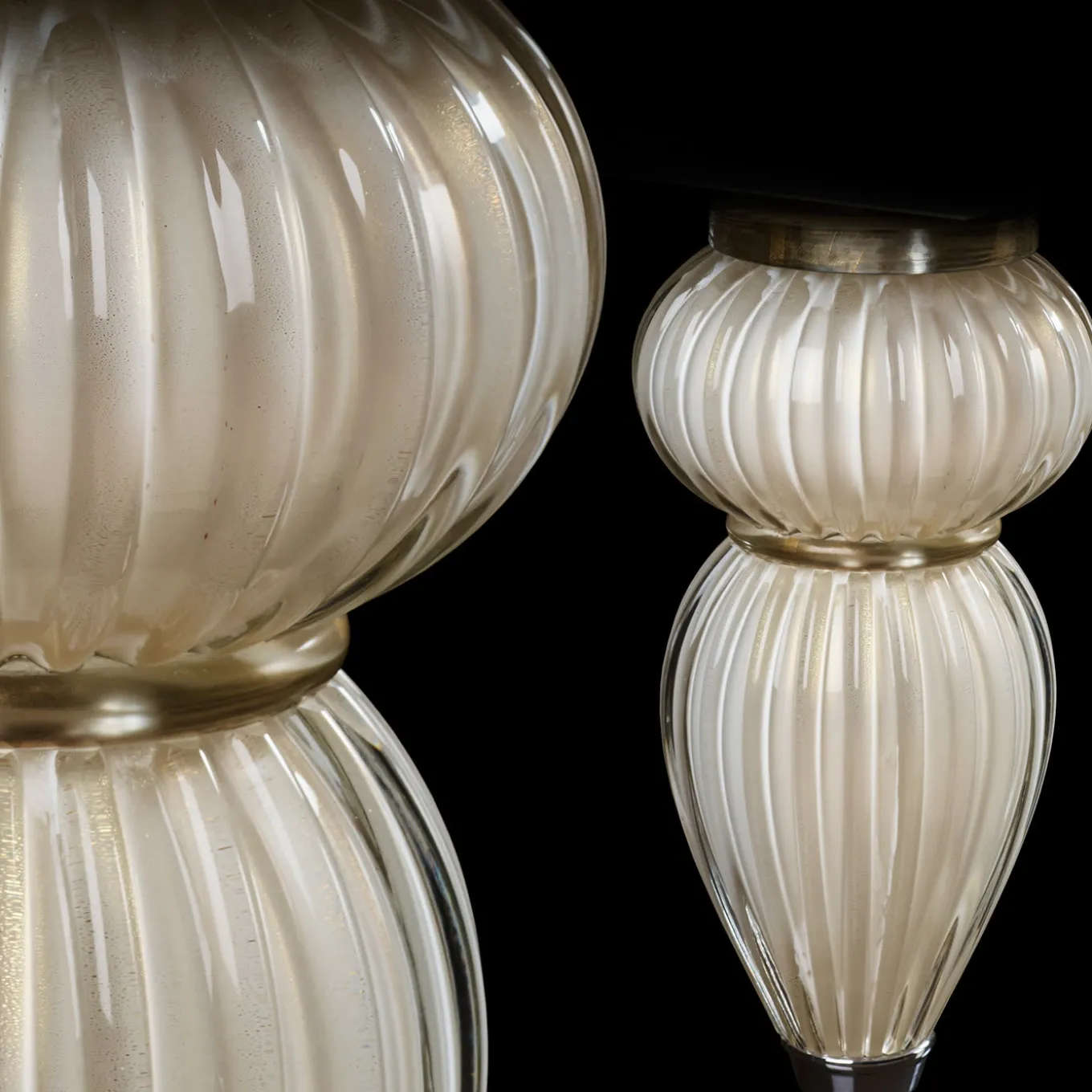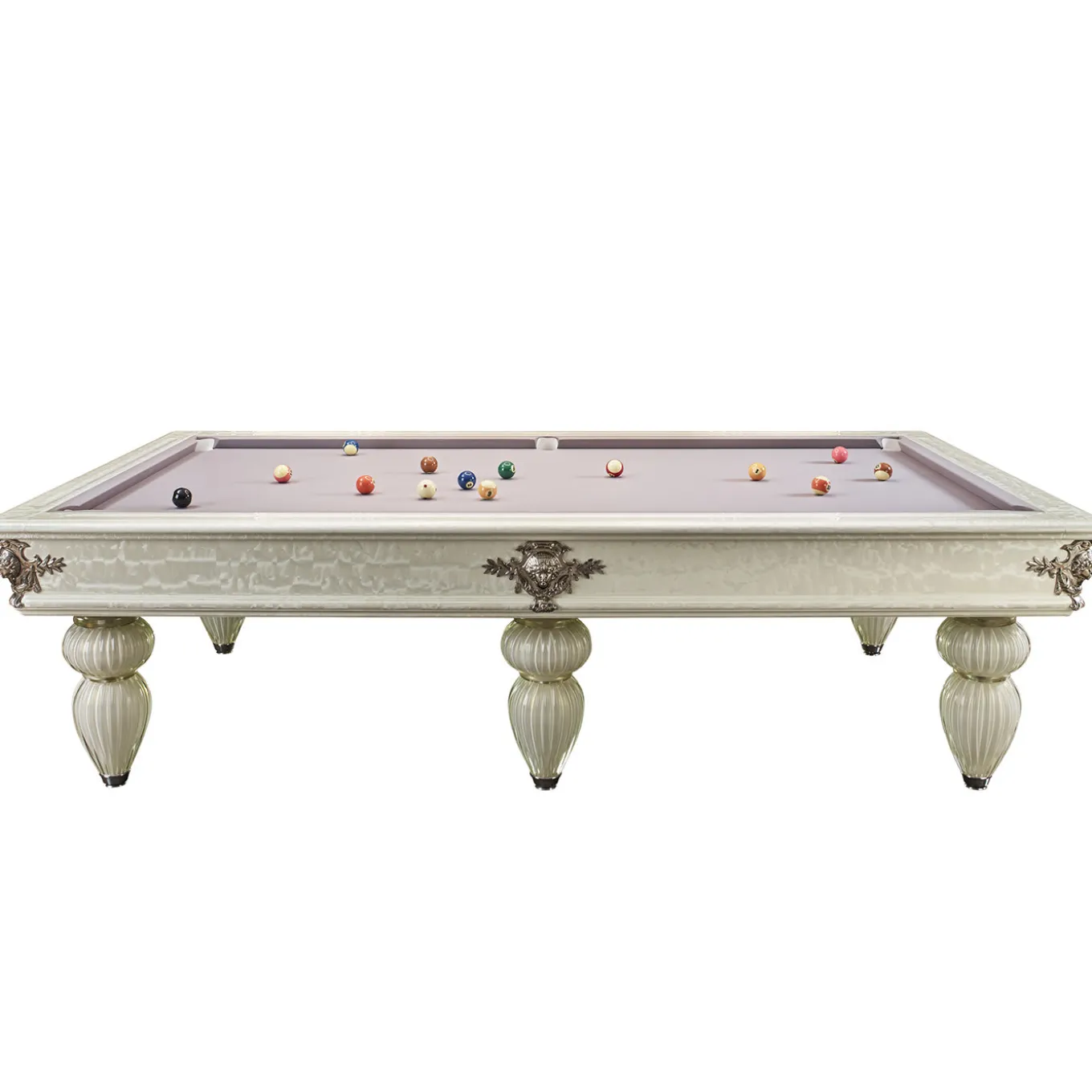 This exclusive artistic white 9ft billiard table was made thanks to the collaboration with the Venetian Masters, renowned and famous all over the world for the workmanship of the inimitable Murano Crystal. This uniquely elegant piece features 6 spherical bases in crystal glass made with a twisting technique with 24 Kt gold leaf supported by a drop-shaped stem.