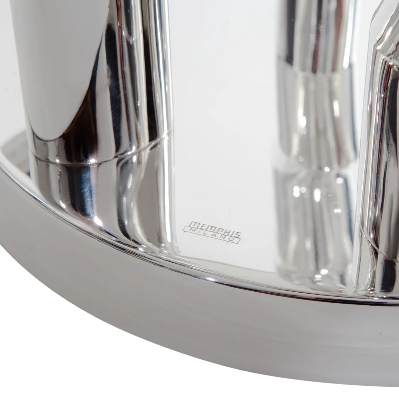 This striking centerpiece was designed in 1982 by Ettore Sottsass. Its silver-plated brass structure comprises a round base from which stem six zig-zagged vertical elements that support the top tray in the shape of a round plate. This unique design is inspired by the exotic city of Murmansk, in the farthest north-eastern region on Russia. This elegant object of functional decor is also available in solid 925 silver, please ask the Concierge for details and pricing.