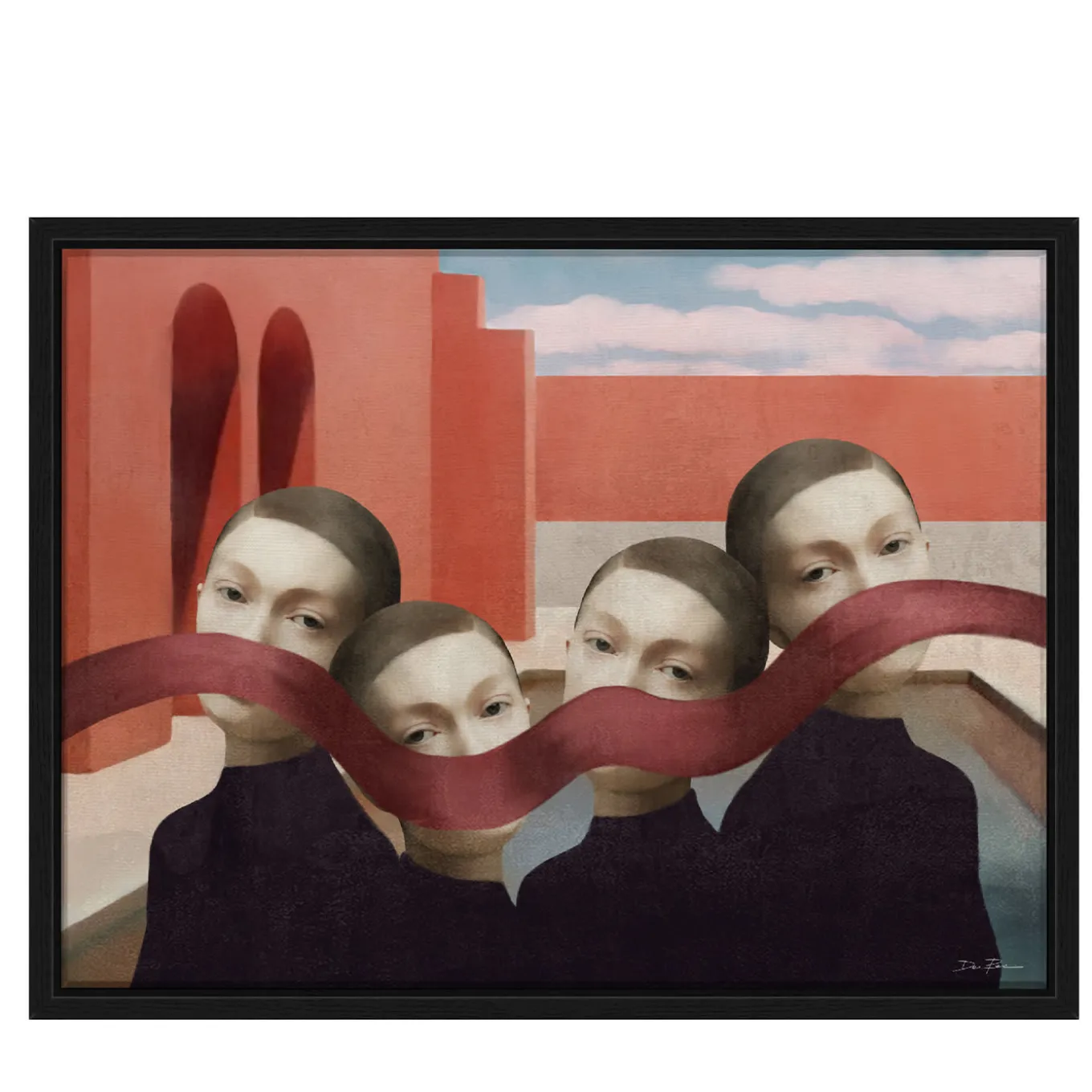 This digital painting is a Pop-Surrealist exploration of the 2020 coronavirus pandemic. It depicts four young girls boxed in by their architectural environs, while a red band covers their mouths and noses, allowing only their suffering gaze to break through. Signed, numbered Limited Edition with Certificate of Authenticity. Canvas mounted on spruce. Basswood box frame.