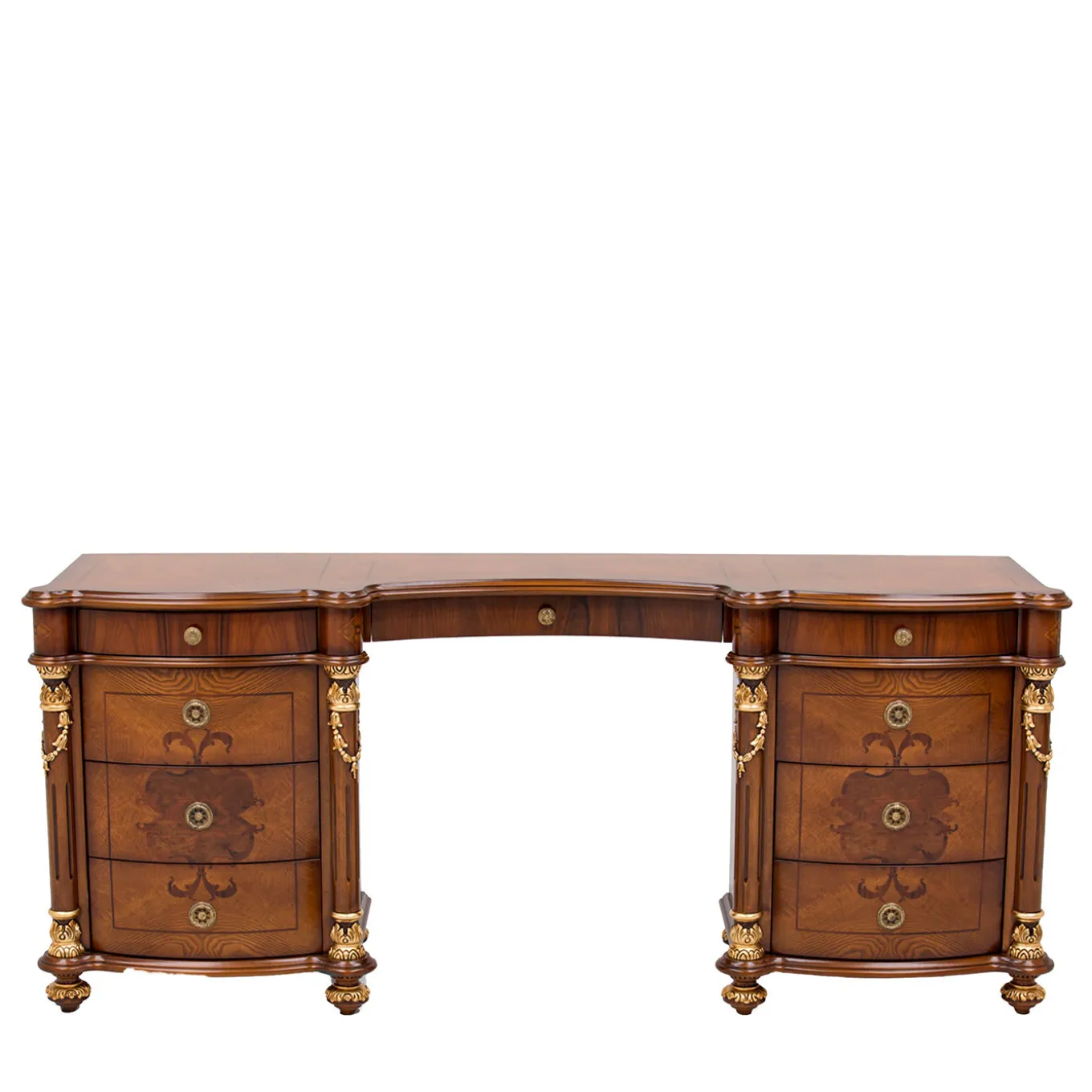 The distinctly classic inspiration of this vanity desk is evident in its bold and ornate silhouette crafted employing prized woods. Its sturdy wooden structure – providing nine drawers for storing make-up and skin-care favorites – boasts fine inlays in rosewood, feathered ash, and walnut briar that impeccably harmonize with the luminous carved elements coated with glistening gold leaf.
