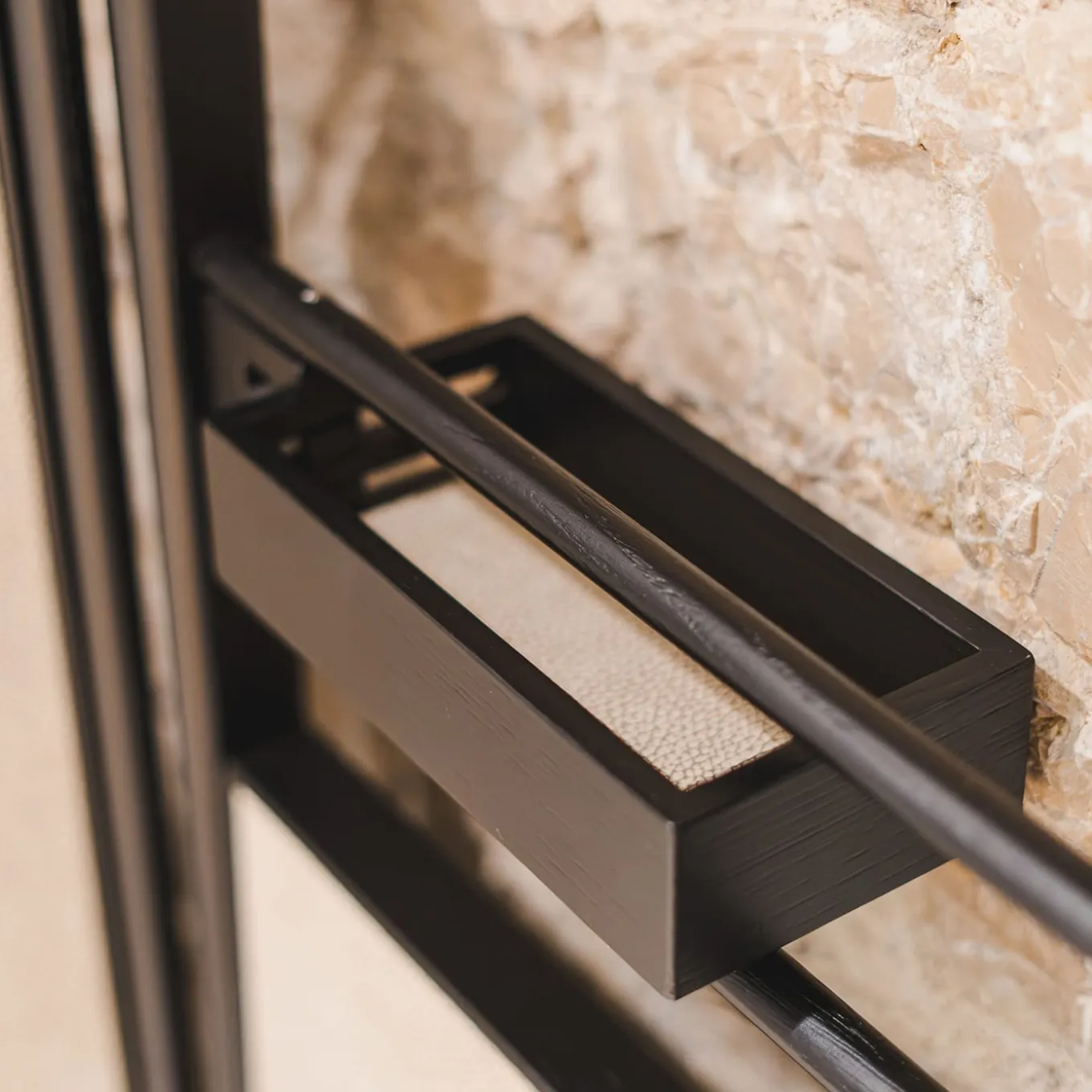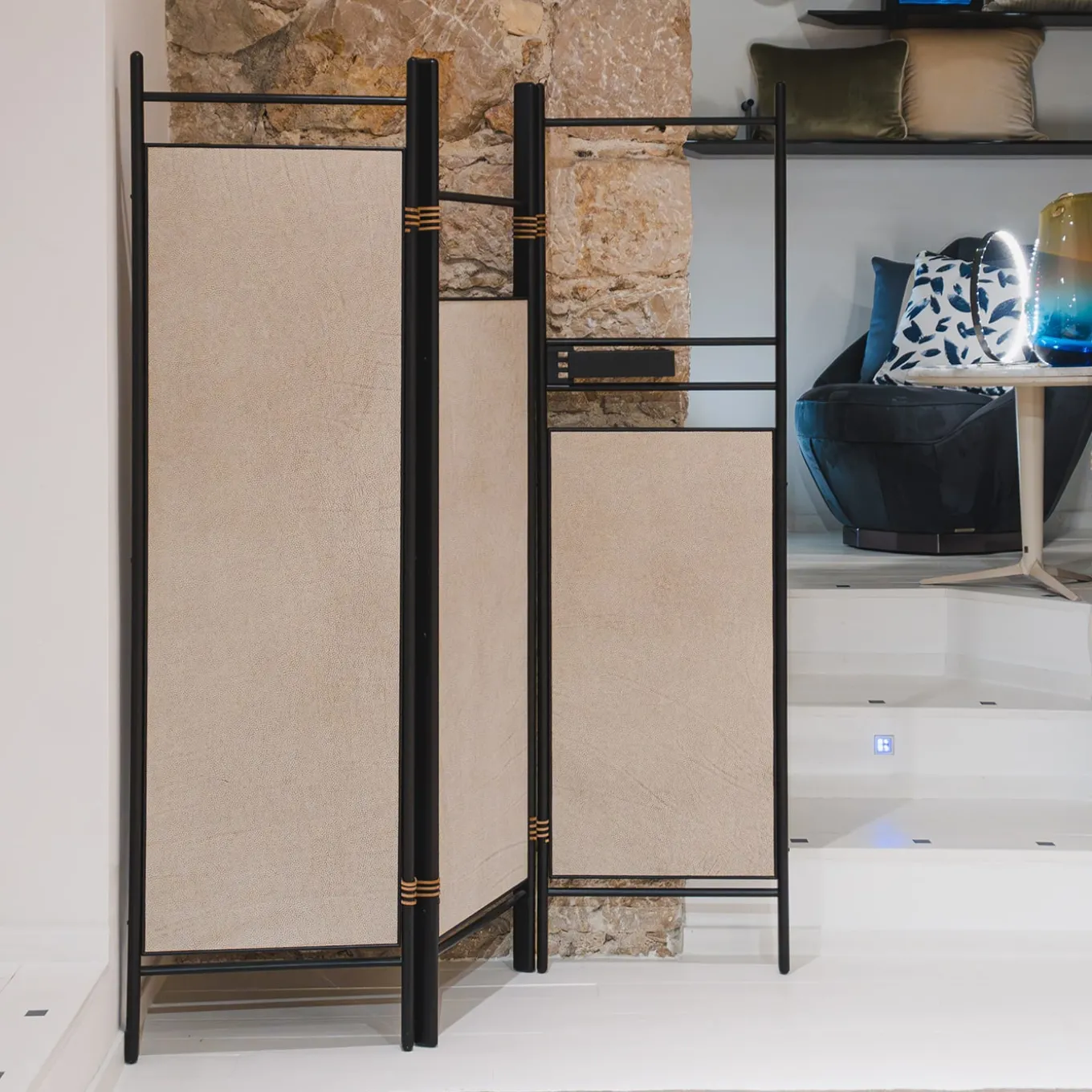 A sophisticated piece of functional decor that will create a private area in a large room, this screen is composed of three panels that can open completely to 360° covered in fine Moteado leather. The structure is made of stained oak and is enriched with hinges made of woven natural leather. The three screens are available with different covers (stained cork, fabric, leather, or mirrors), please inquire with the Concierge for details and pricing in the different options.