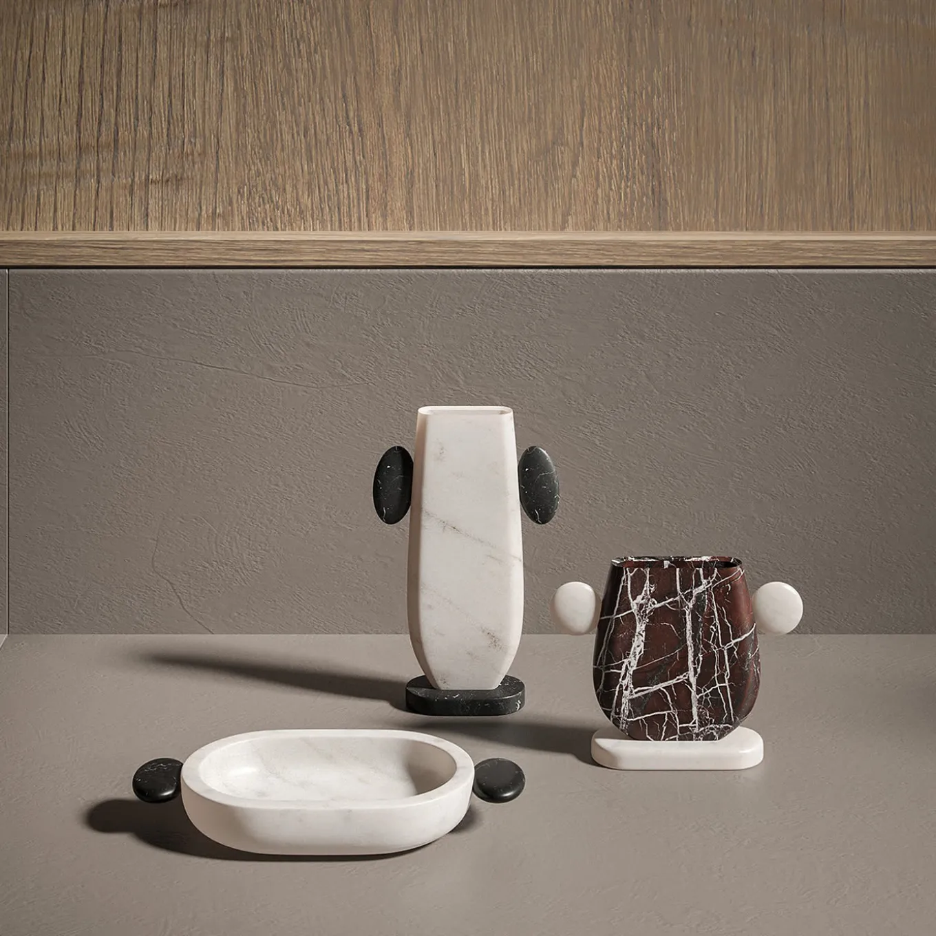 Soberly ironic, the anthropomorphic shape of this design was conceived by Matteo Cibic to make it suitable as a penholder, a toothbrush holder, or as a vase for dried flowers – inner glass or plastic jar is recommended if displaying fresh flowers since the marble is not water-resistant. Playfully resembling ears and a mouth respectively, the side handles and the base are both crafted of black Marquina marble, while the recipient is in white Michelangelo marble for a superb chromatic contrast. Please note that marbles and stones are natural materials and they can differ also if coming from the same quarry or the same block. The product shown may differ from purchased items. Every piece is unique. Vases made of various marbles cannot guarantee watertightness. It is not recommended for cut flowers unless with the use of vials for each flower or of an internal glass/plastic jar. Please read carefully the unpacking and handling instructions.