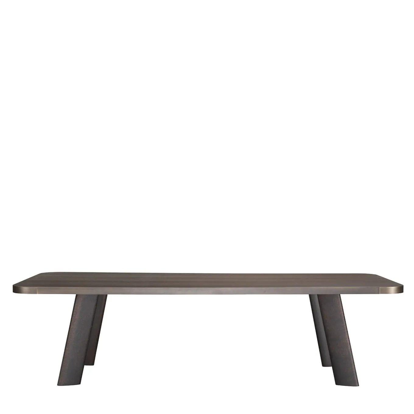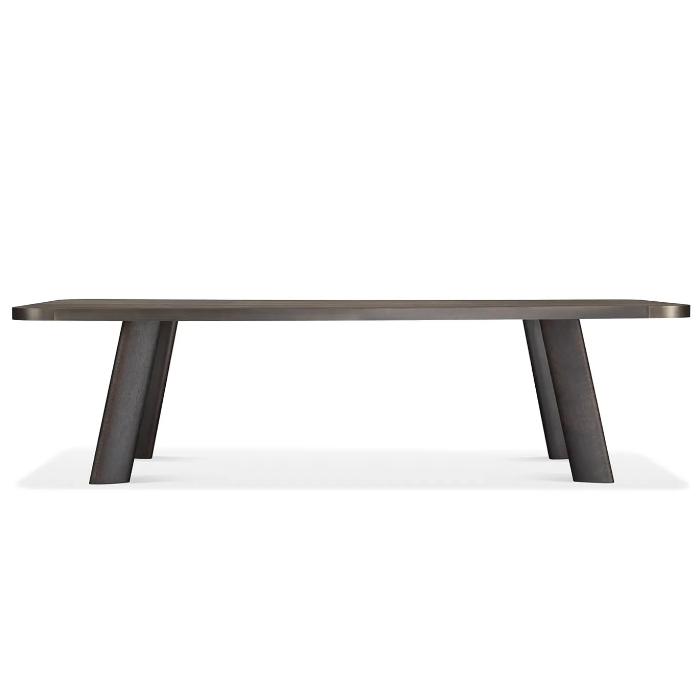 A deft balance of proportions and volumes ennobled by a sophisticated combination of finishes and textures defines the look of this precious dining table. It is crafted of solid wood and finished with a metallic band embracing the tabletop’s perimeter that lends it a strong urban personality. Its bold silhouette consists of a majestic top with rounded corners resting on four bold, slanted legs. Please contact the Concierge for details on variants.