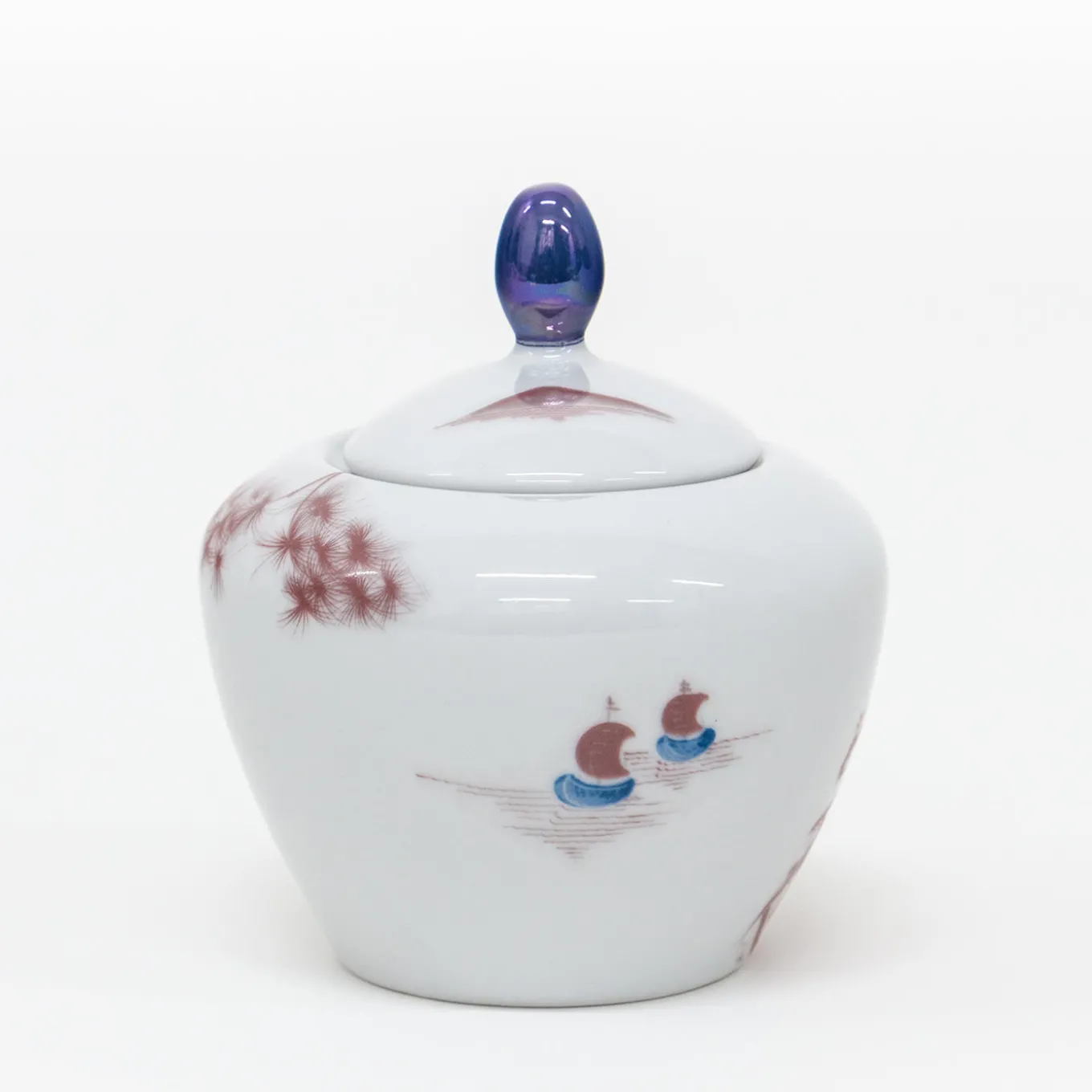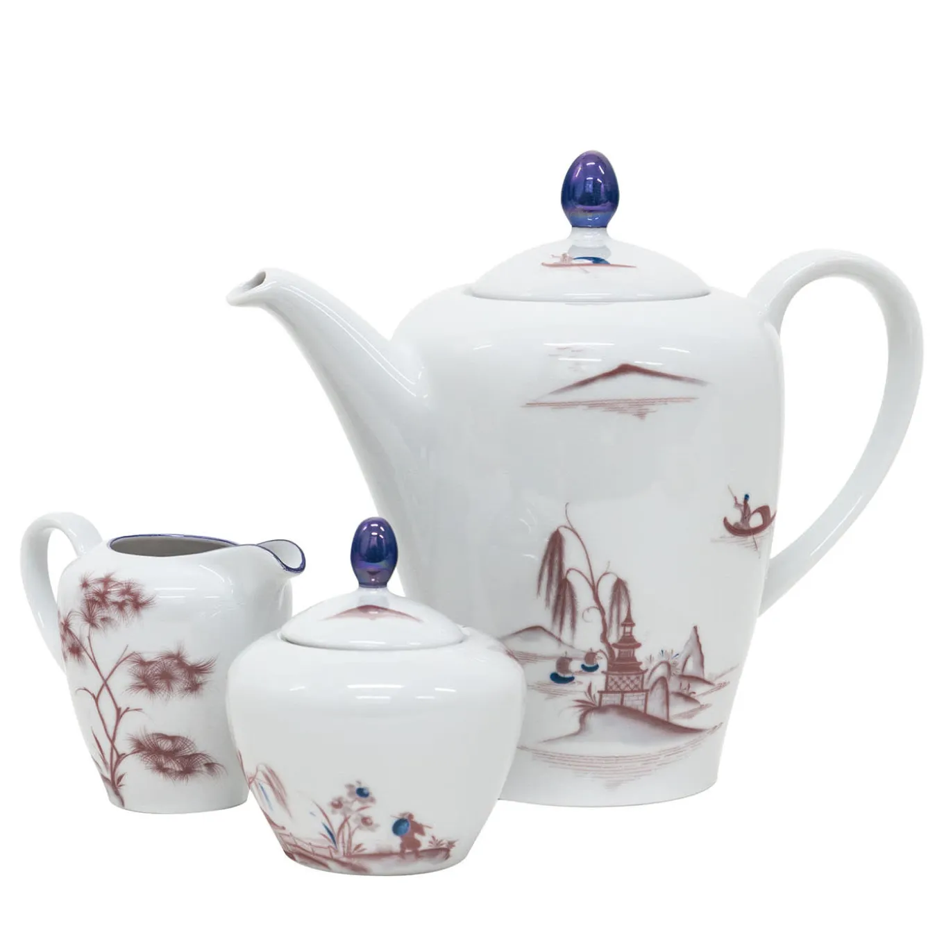 Evoking the serene simplicity of summer, this tea set, composed of a tea mug, a sugar bowl and a milk jug, features a handmade painting of an idyllic Japanese landscape inspired by the traditional Imari imagery, distinguished for its three-color palette.