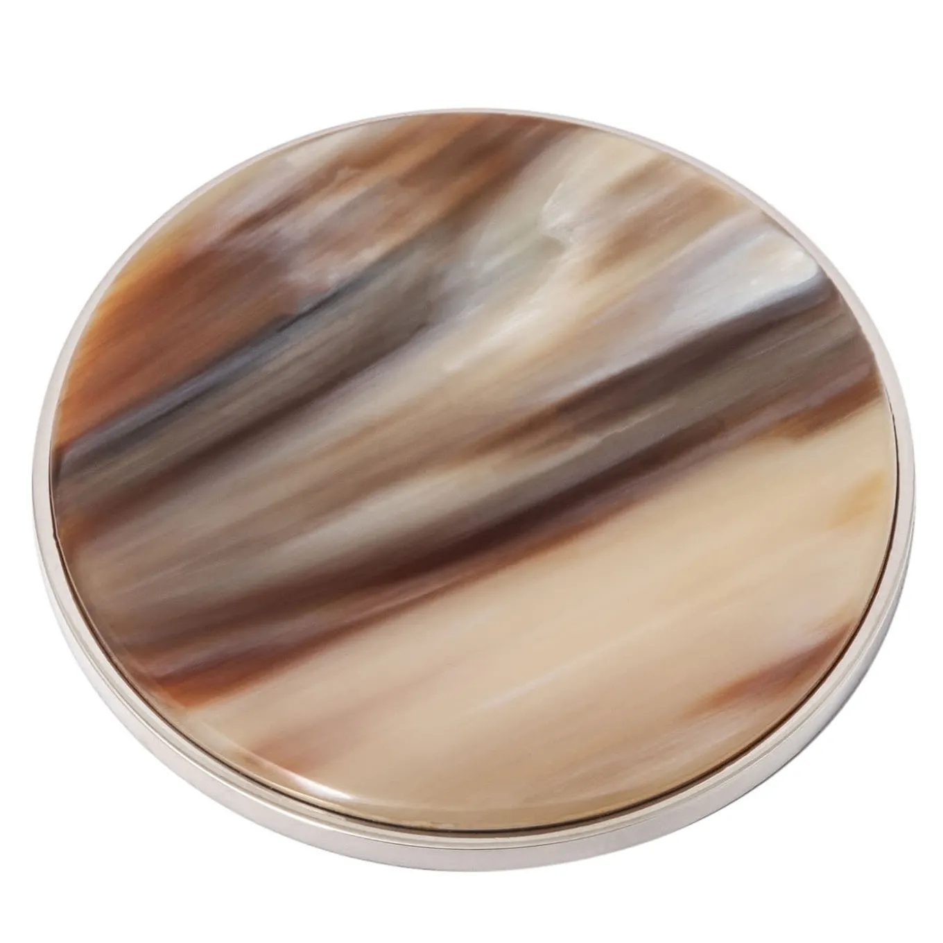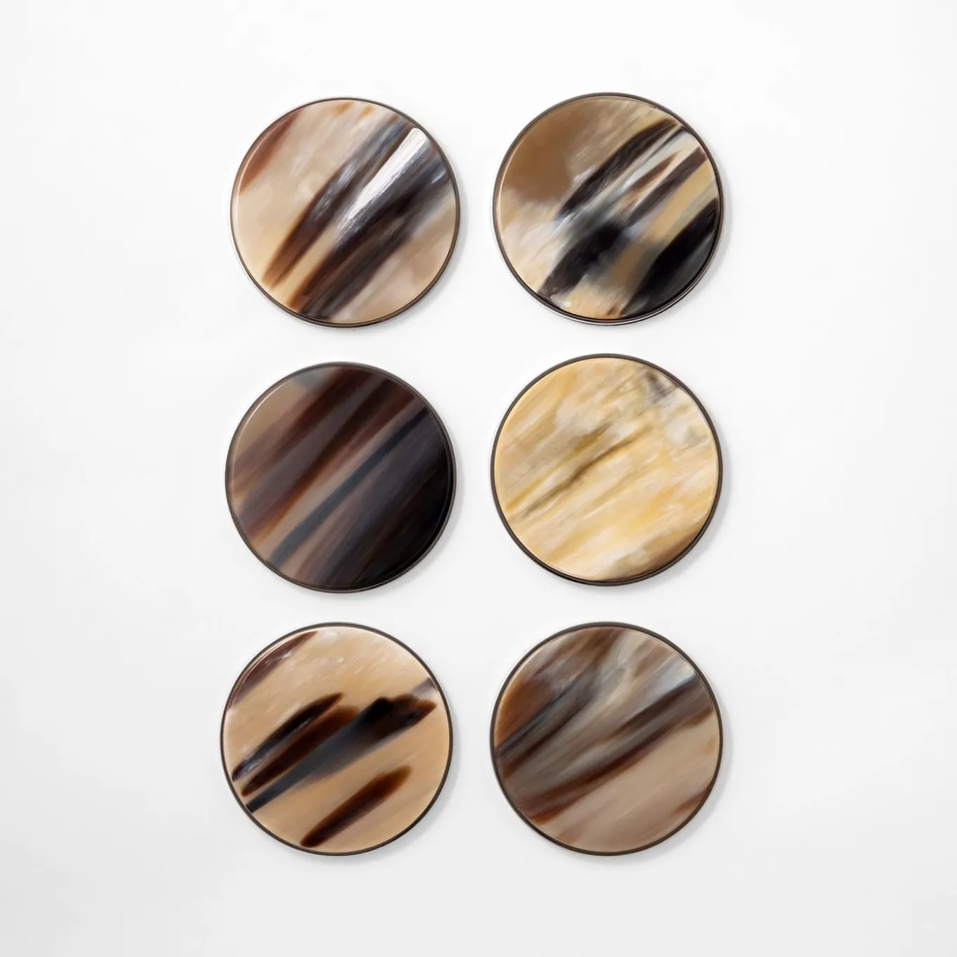 This stunning Set of 6 Coasters in Natural Horn is handmade and waxed to maintain its natural properties. Being a natural product, the horn may feature slight variations in size and in color, all contributing to the unique and luxurious quality of the item. The base is made in nickel-plated brass that compliments the horn spectacularly.
