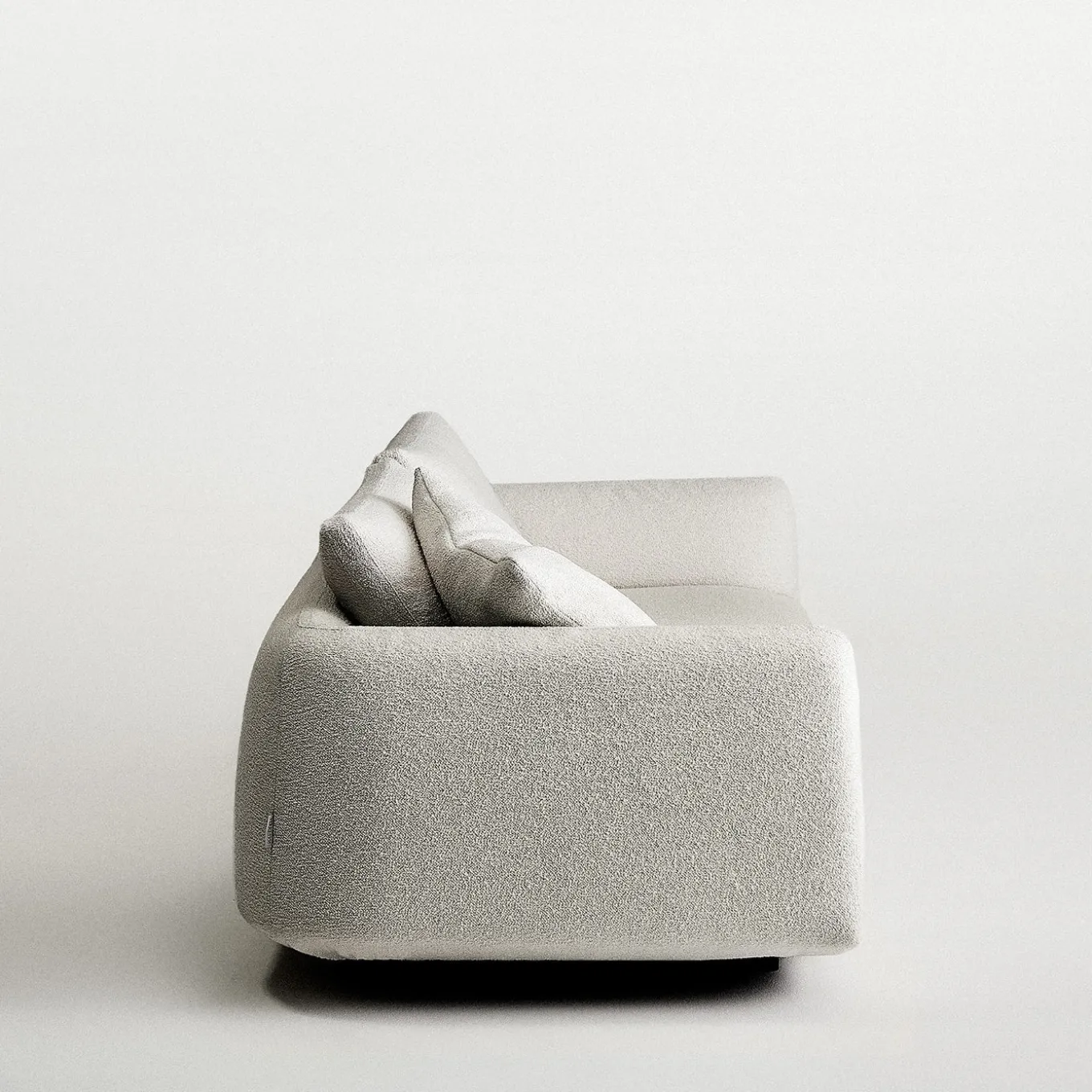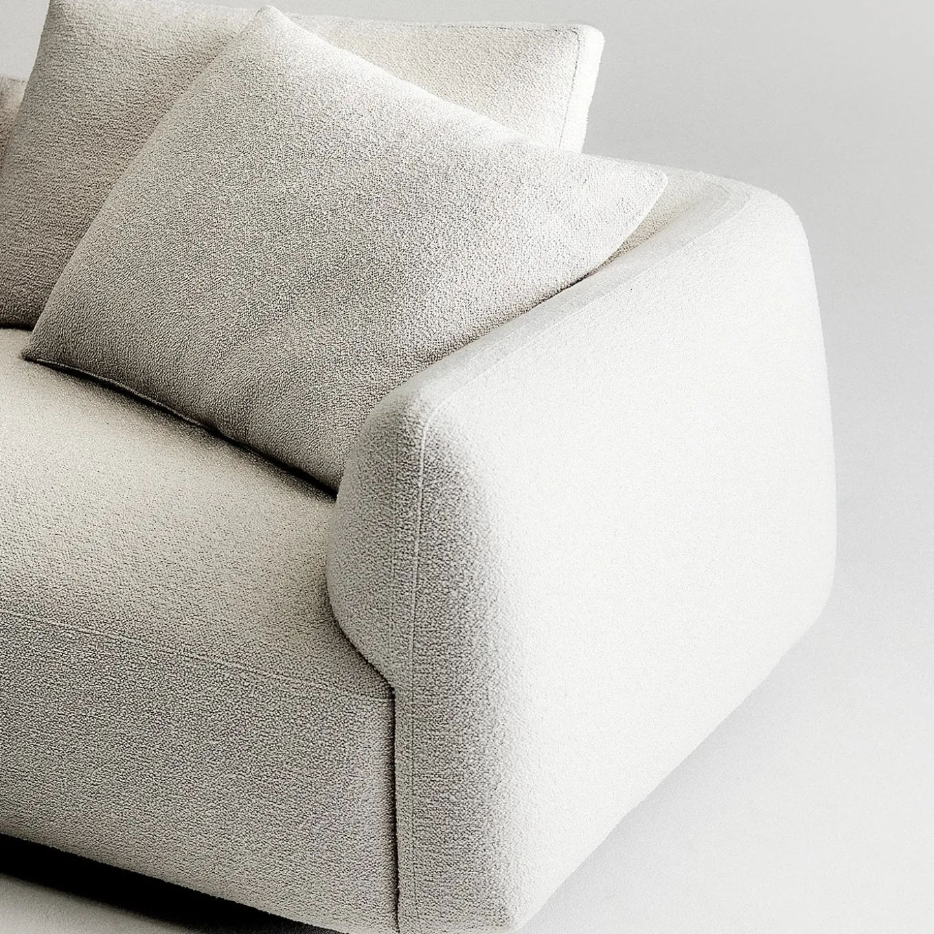 Indulgence in padding and bulging lines exudes sink-in comfort in this elegant sofa designed by creative duo Ludovica and Roberto Palomba. The white boucle fabric (Barnum/1) upholstery entirely enveloping its plump volumes is responsible for its distinctive pleasant tactile feel. Bold yet refined, it is available in different modular compositions, please inquire with the Concierge for options. Decorative cushions are included.