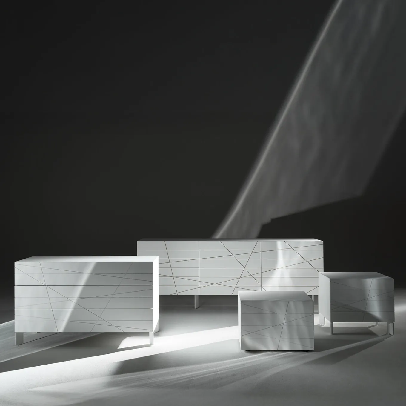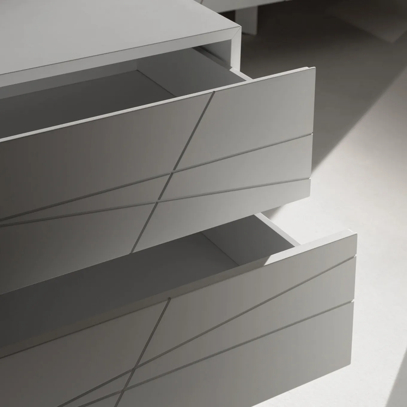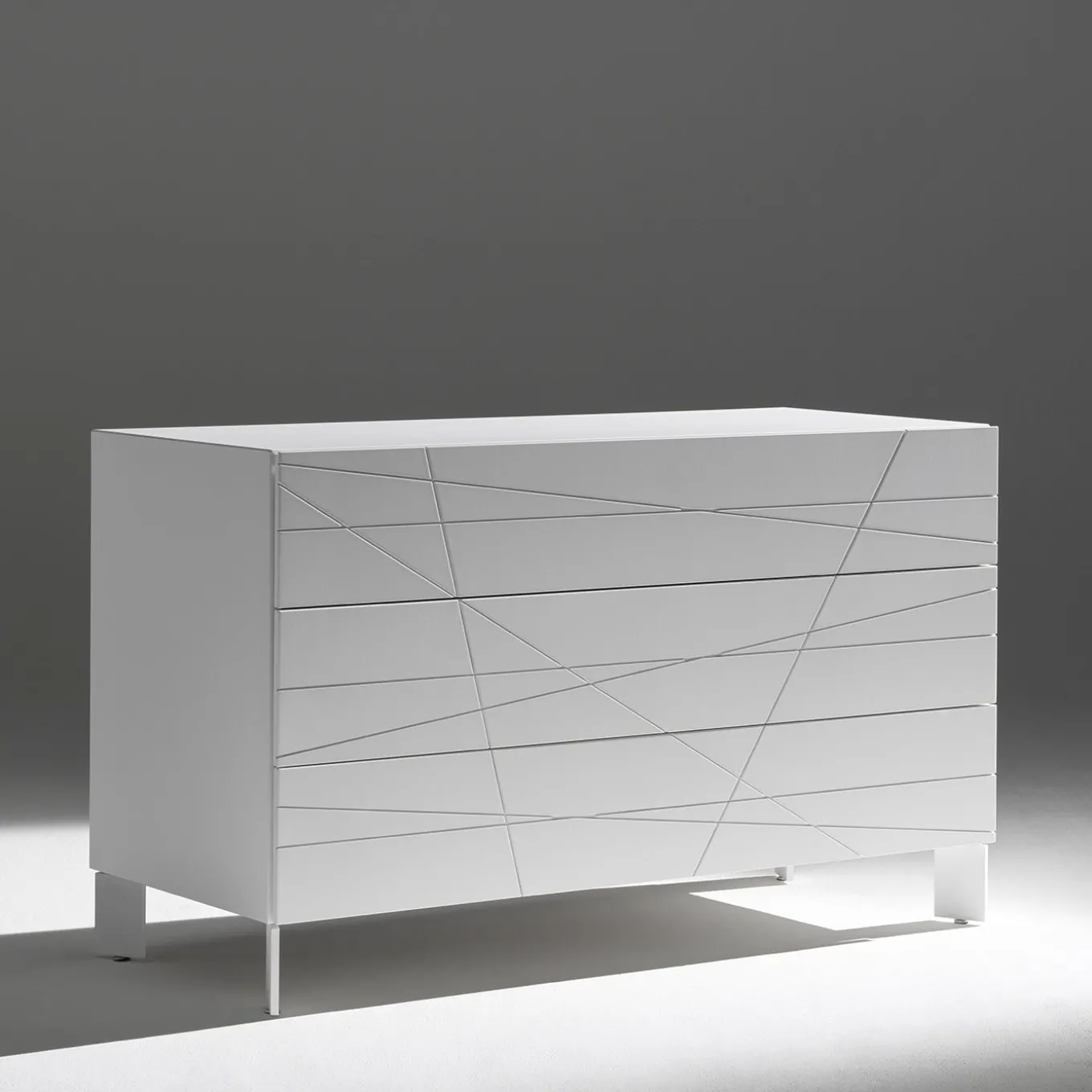 Dresser featuring a sleek structure with a lacquered finish and smooth front drawer panels. Equipped with soft-closing rails, the dresser ensures quiet and effortless use. Available in various finishes and different foot heights, the model shown is in white with 12 cm high feet, combining functional storage with a minimalist design enhanced by subtle linear details on the drawer fronts. Please contact the concierge for more details.