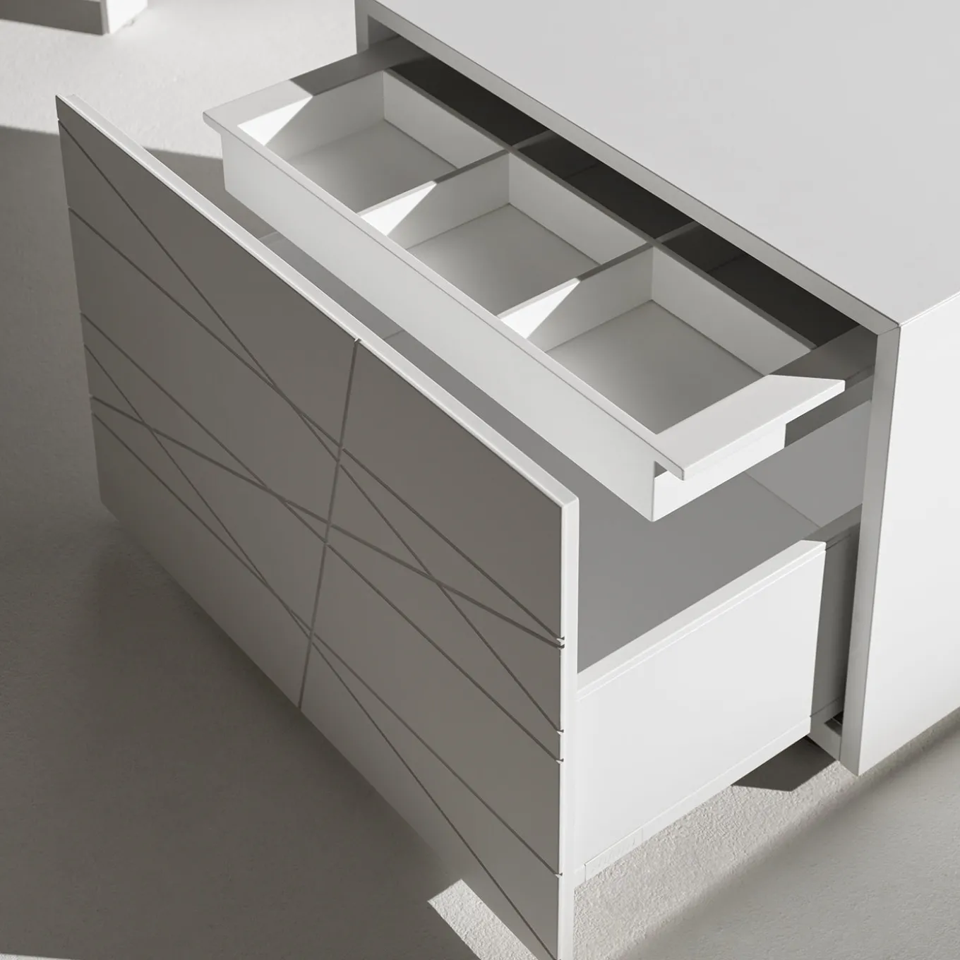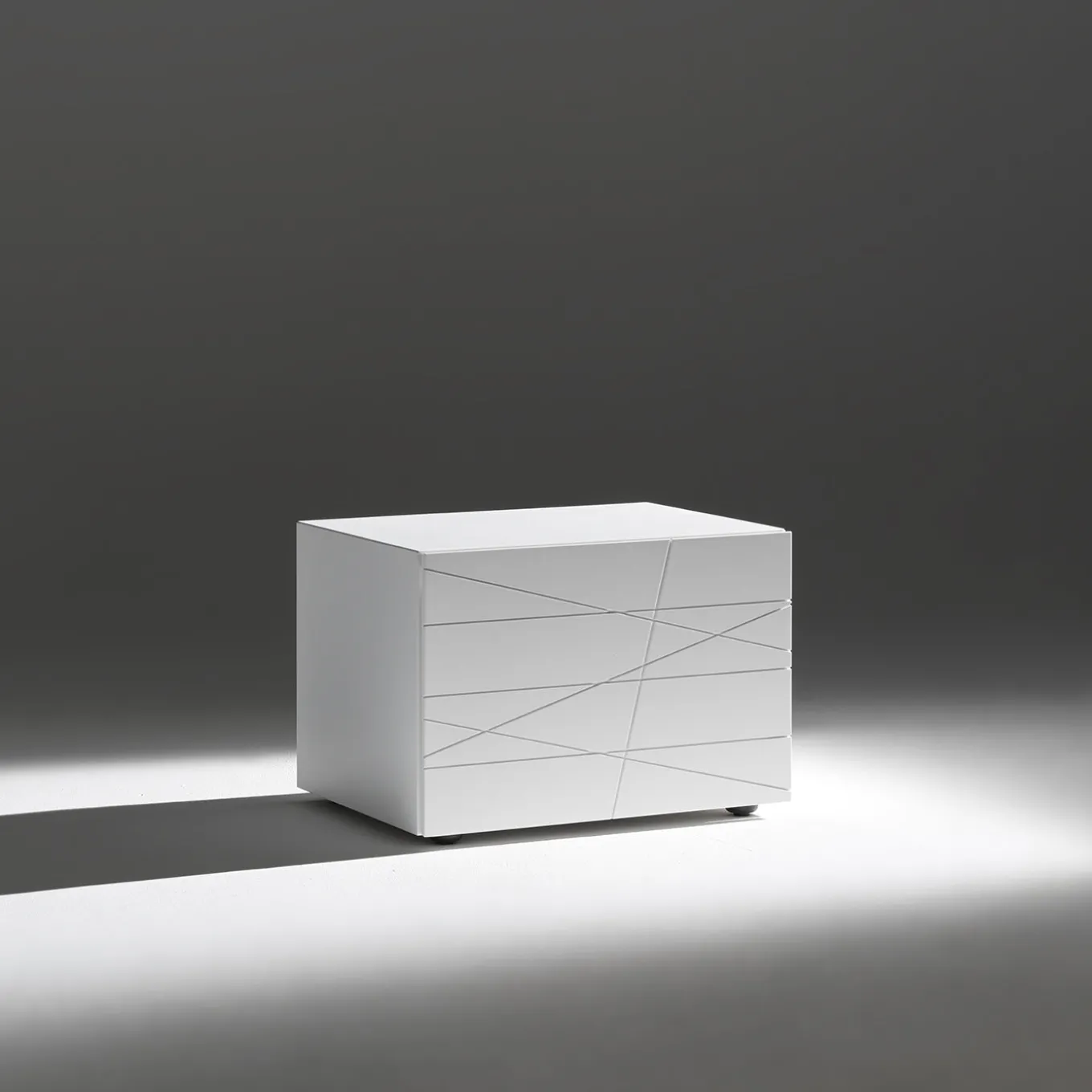The Nazca b 60 features a single drawer within a sleek rectangular structure finished in white or black lacquer. Its standout detail is the front panel decorated with subtle diagonal engravings, adding a modern geometric touch. Compact and versatile, it suits contemporary interiors while providing practical bedside storage.