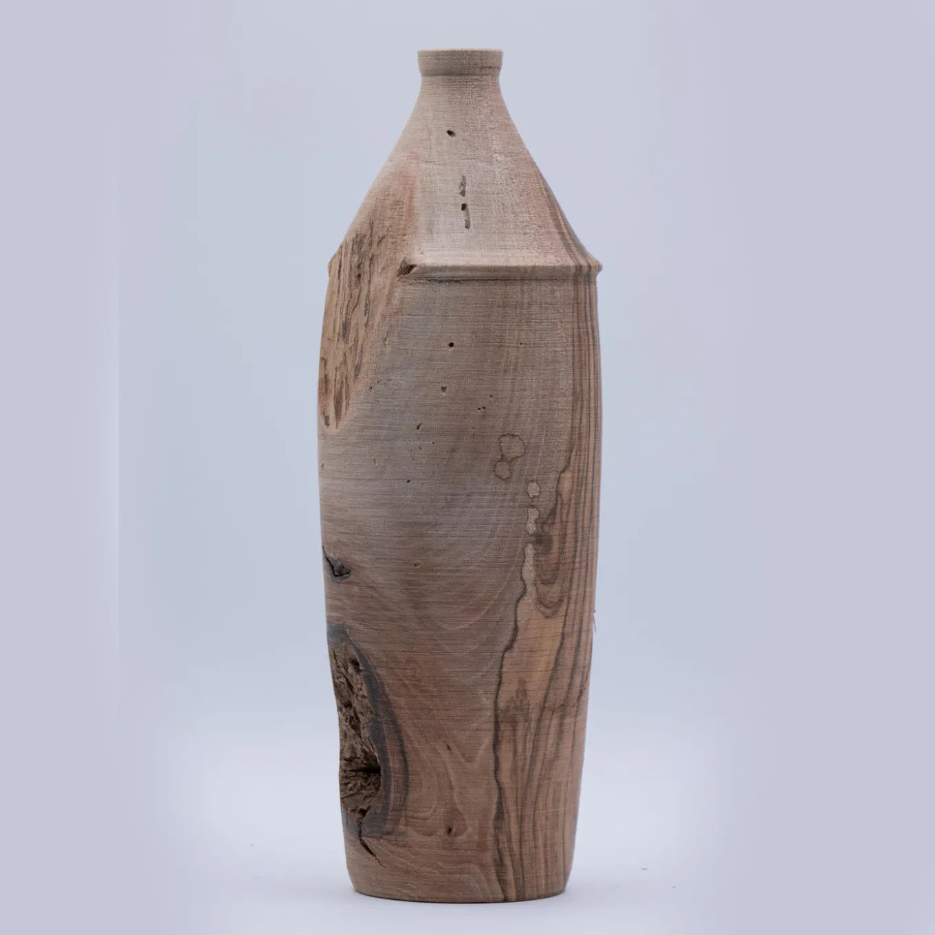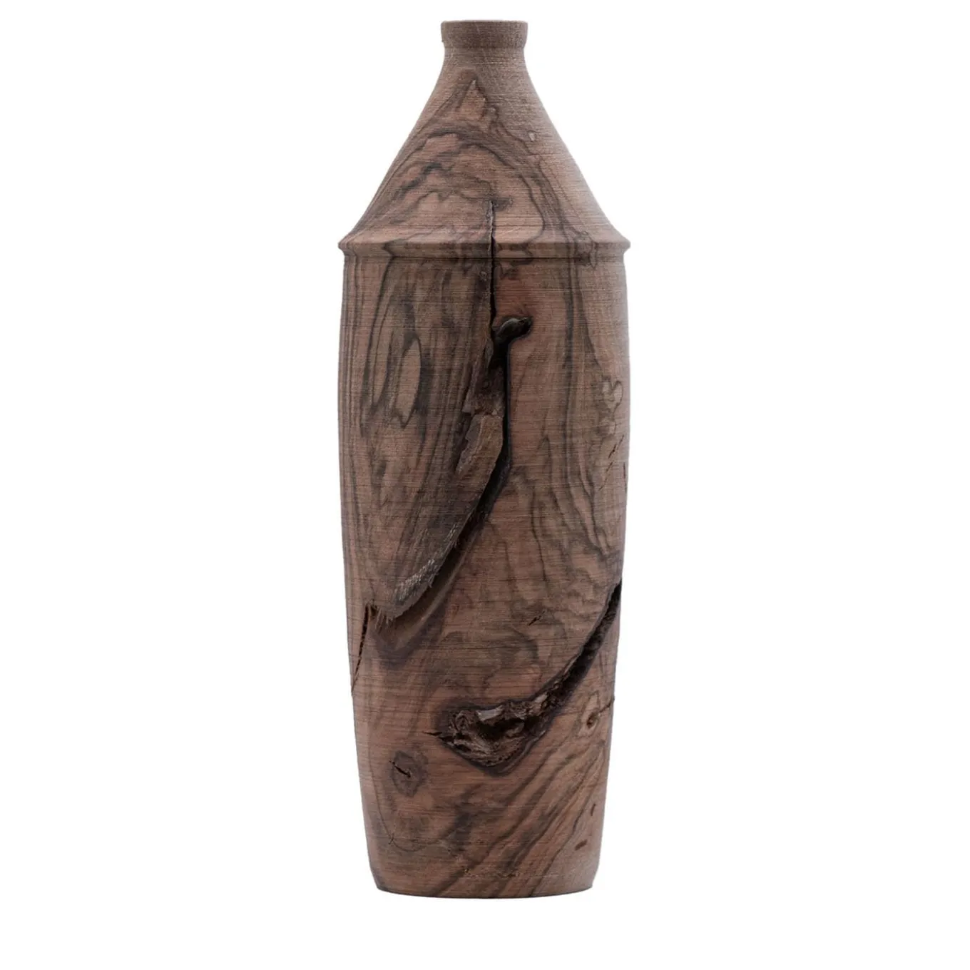 Meticulously handcrafted and carved, this stunning decorative vase stuns with its exceptional wood grain accentuated by its tall, slender silhouette and graceful lines. Fashioned of walnut wood, it is treated with olive oil to seal its natural properties and prevent decay. Do not fill or immerse with water, clean only using a damp cloth.