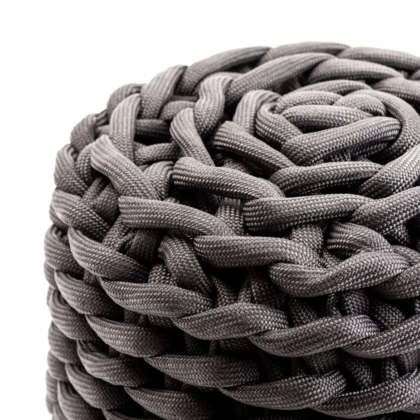 This round pouf, designed by Rosanna Contadini, offers a sophisticated and stylish addition to outdoor spaces. It is handmade of waterproof materials (polypropylene, polystyrene, and Lycra fiber) and covered in deftly hand-knotted 22mm-thick gray-colored polypropylene rope. Its compact design underscores its versatility: it can be used as a footstool, additional seating, accent table, or decorative accessory. Please contact the Concierge for more details.