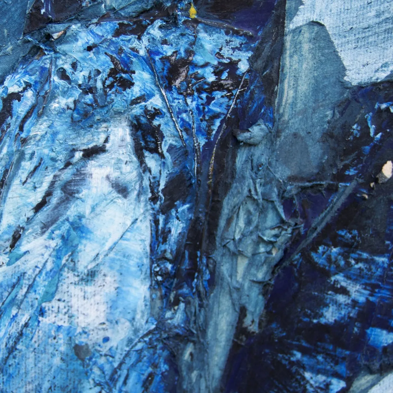 Shades of acrylic blue paint and black ink illuminated by dynamic light brushstrokes evoke the nocturnal atmospheres – with its subtle lights and weather variables – this painting evokes through its abstract traits. The layer of tissue paper covering the canvas welcomes the colors, consequently lightened for a poetic chromatic impact. The piece is delivered unframed and is supplied with an authenticity certificate.