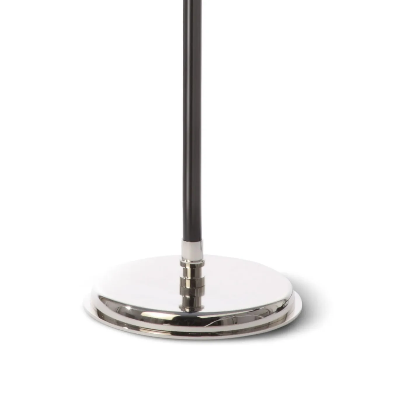 Straight elements and curved shapes alternate in this elegant lamp made entirely in metal and featuring a round base supporting a round section shaft comprised of three parts. The semi-spherical shade faces downward and can be directed where needed. The metal is finished in glossy nickel with the exception of the elongated shaft that is painted with a dark varnish, giving a striking contrasting effect.