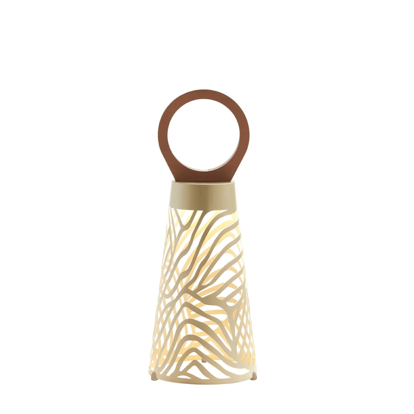 Noora, Arabic for “light”, is a portable outdoor lantern designed by Lorenza Bozzoli. Its conical lampshade, varnished for outdoor use, has a modern and elegant design. The iroko wood handle is water-resistant. Noora features a rainproof LED light, 30W power, 9900mAh lithium battery lasting six hours. The LED can be easily inserted and removed from the lantern thanks to a magnetic mounting system. It’s rechargeable via a supplied USB cable and controllable with a remote.