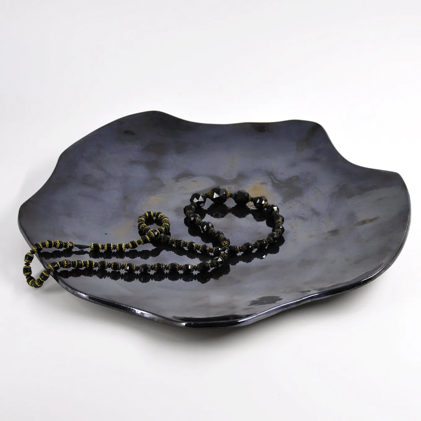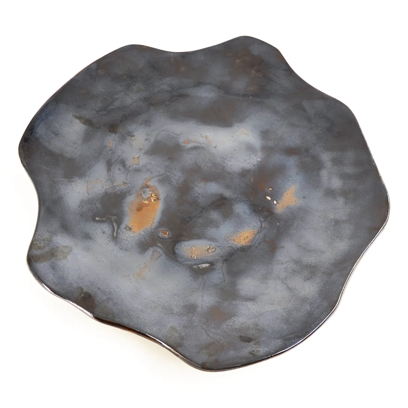 A decorative ceramic plate featuring a fluid, irregular silhouette with pronounced edges and a glossy dynamic texture. Its surface showcases metallic reflections and gradations from bluish gray to burnt copper tones, with concentrated copper hues in the center resembling illuminated craters at night. With a generous diameter of approximately 36 cm, it offers a sculptural presence ideal for modern or eclectic interiors. Includes packaging, authenticity certificate, and care instructions.
