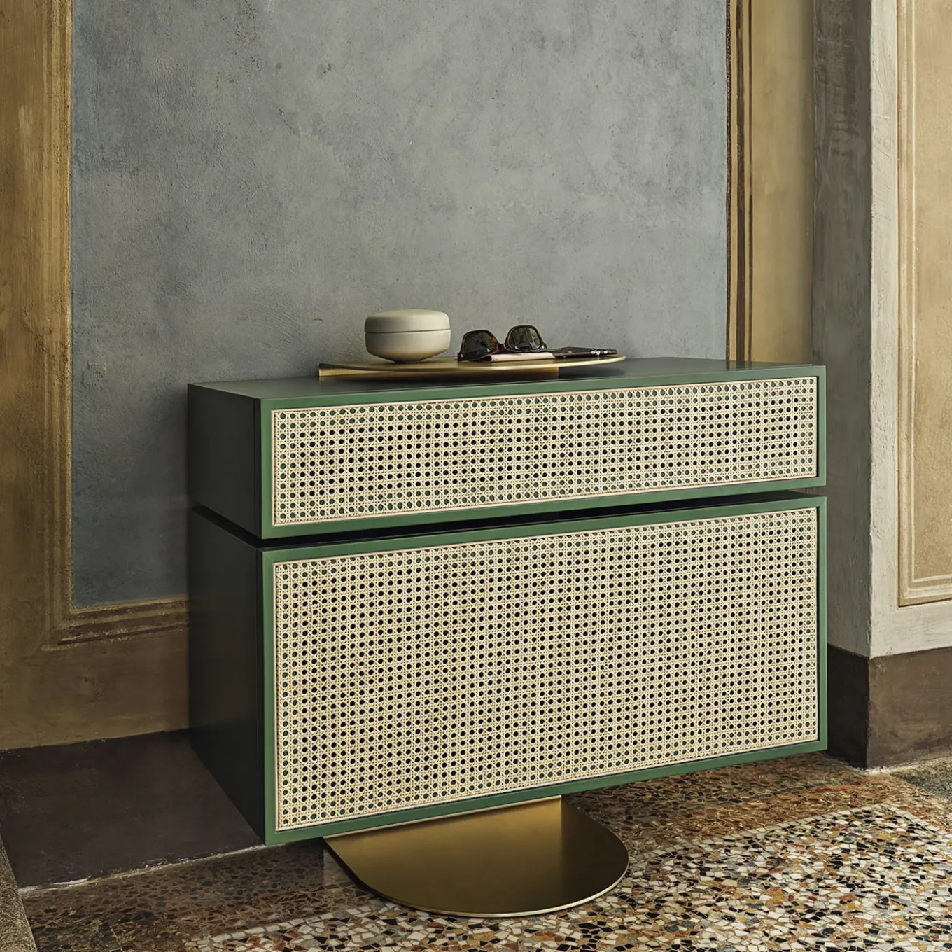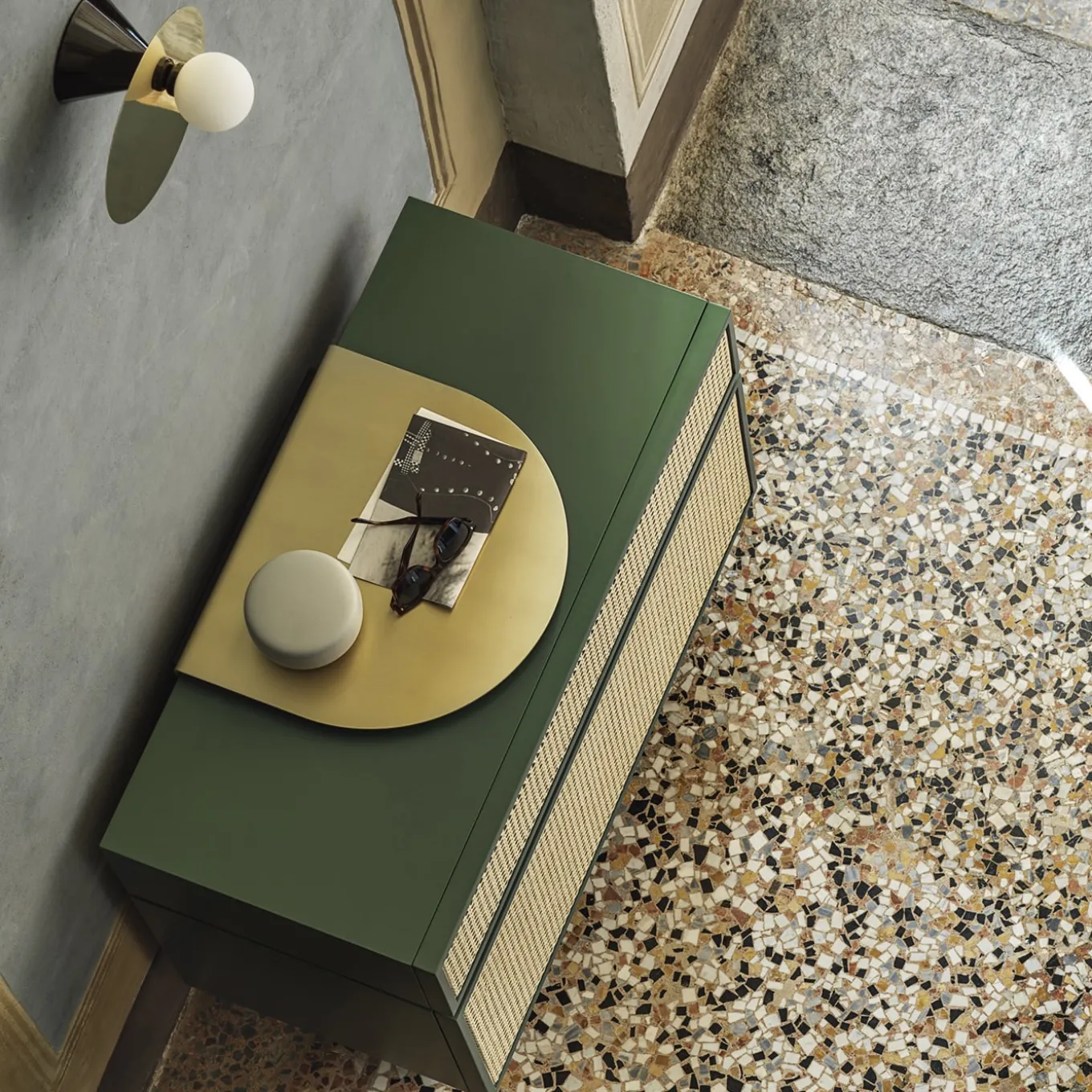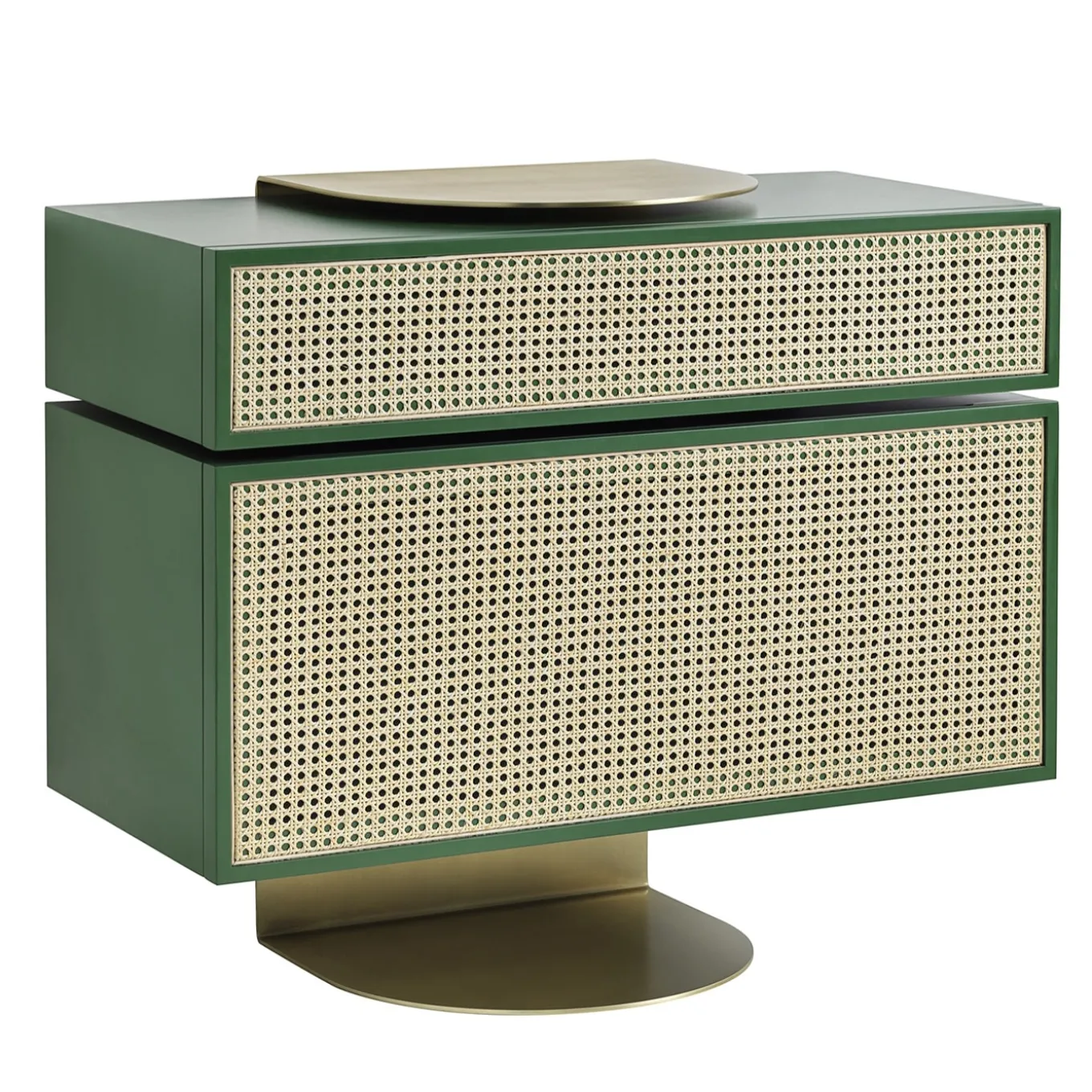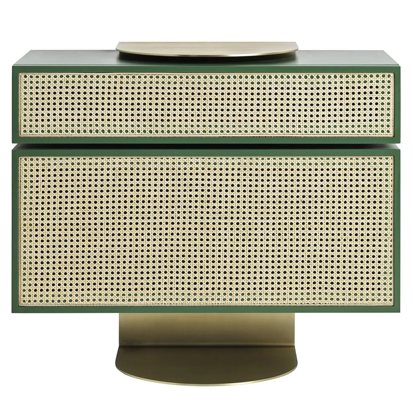 Part of a series that includes a vertical cabinet and a sideboard, this drawer, embodies the harmonious and elegant encounter between architecture, design, art, and craftsmanship. Deftly handmade of green-lacquered wood and Vienna straw, its sleek and modern shape with two drawers can be wall-mounted thanks to a satin brass-finished metal structure.