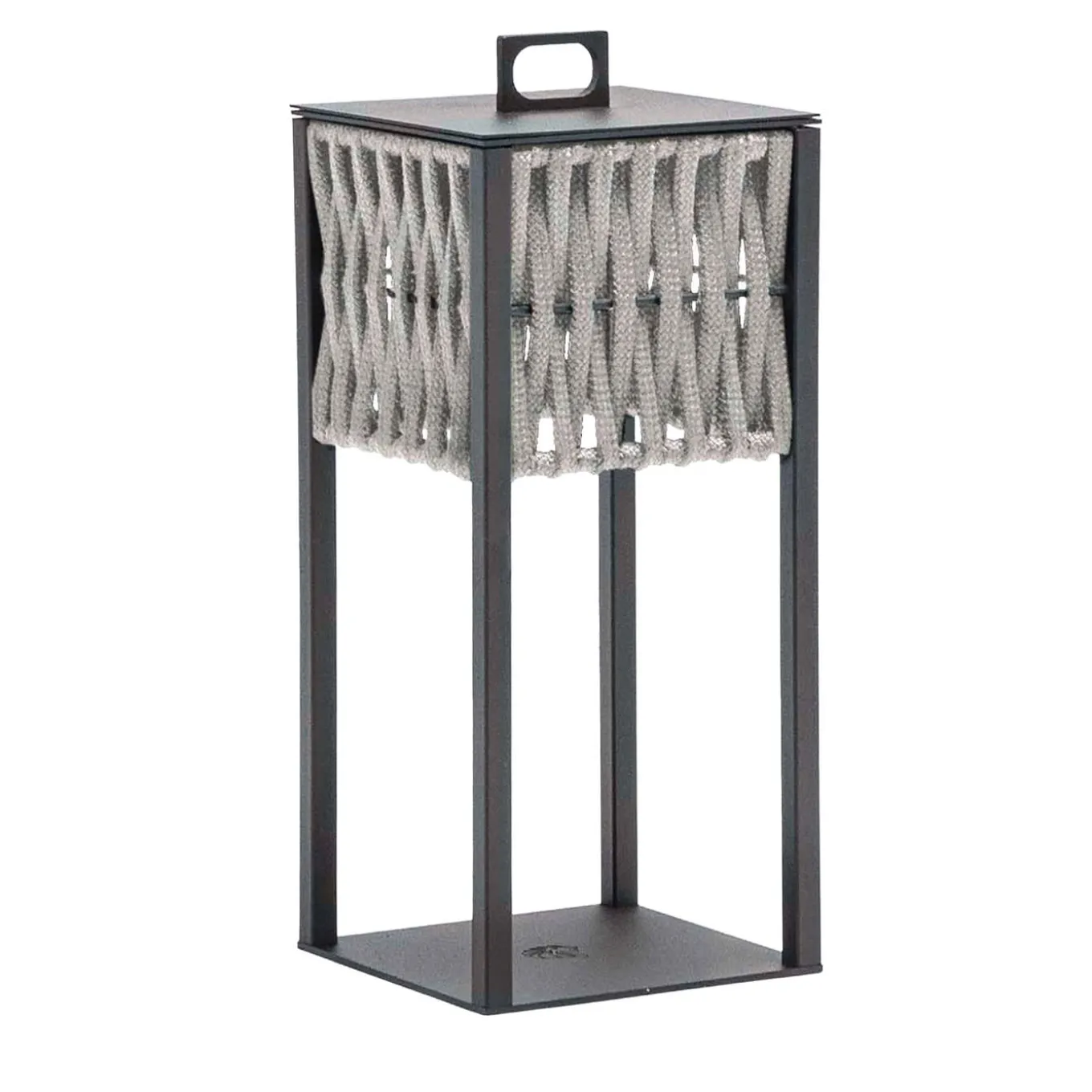 An outdoor medium lamp made of a combination of satin black metal treated in cataphoresis with lasered Giorgio Collection logo and gray woven cordage. Light bulb unit removable and rechargeable through USB-c port.