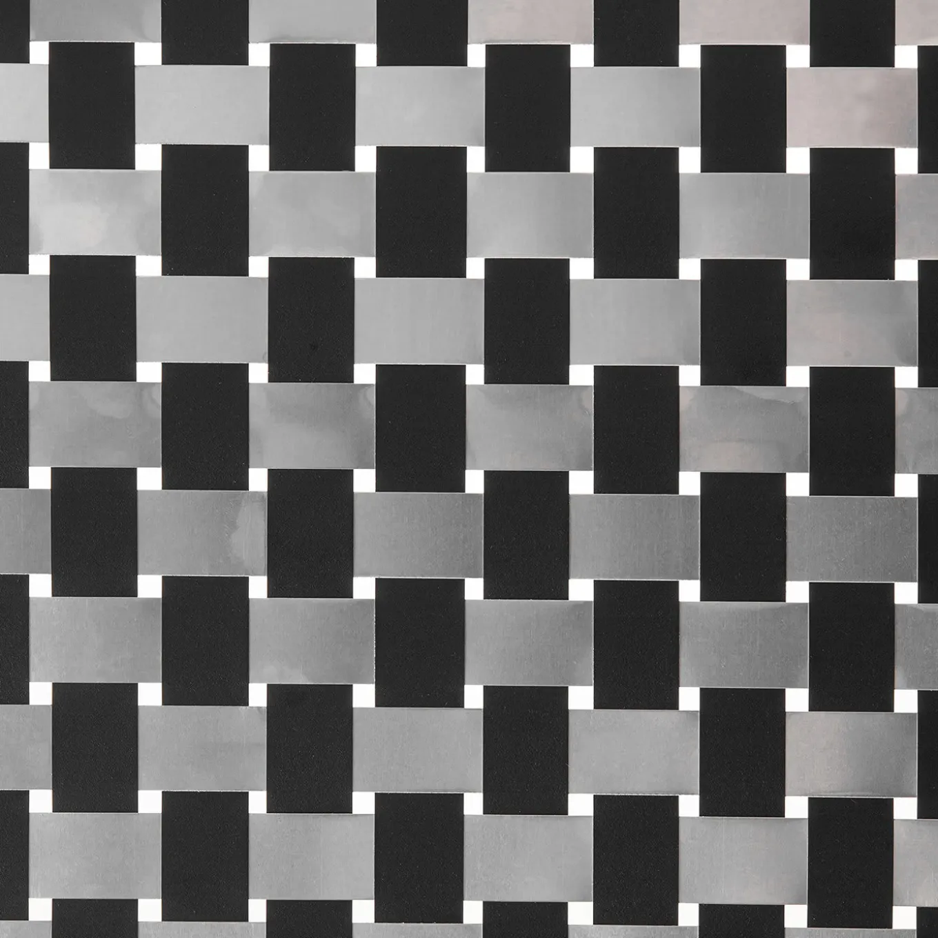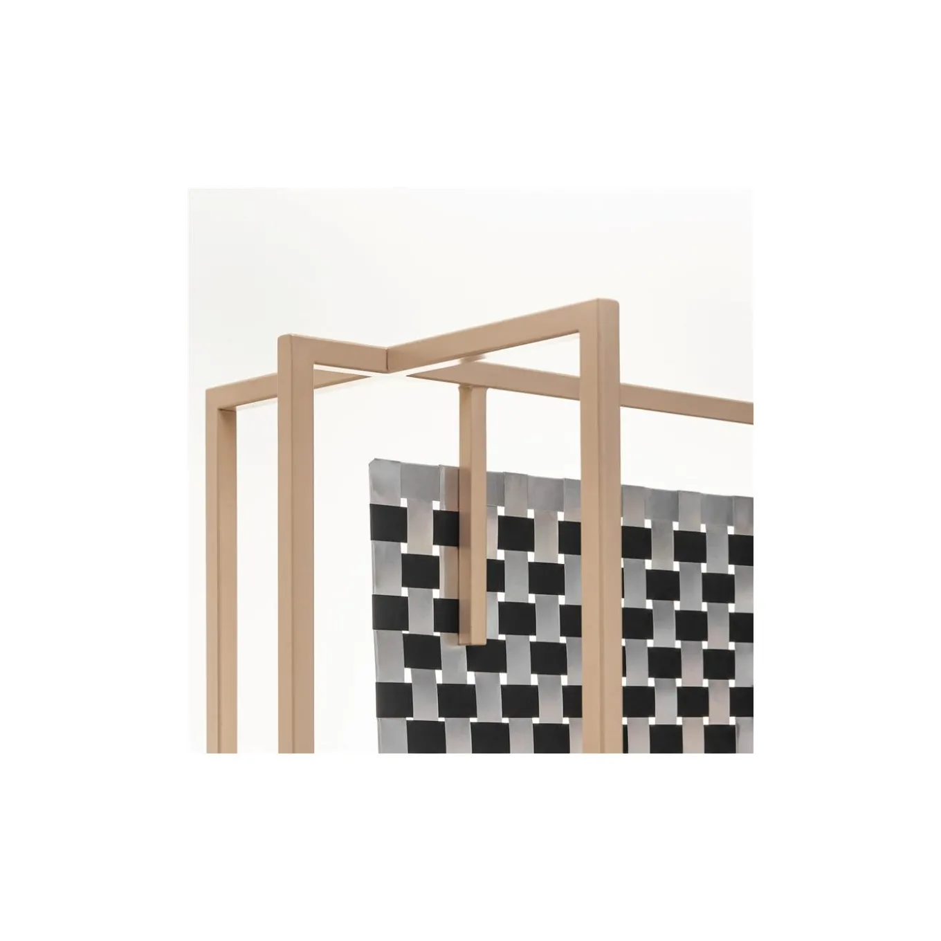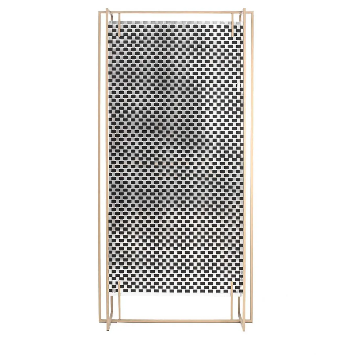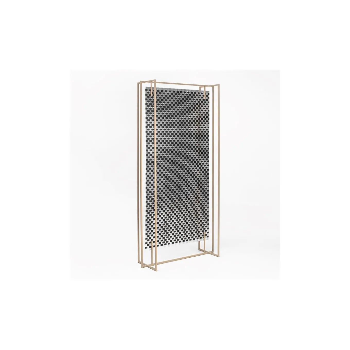 This sophisticated floor panel features an elegant, thin, gold-colored frame and stylish 60s Op-Art canvas. Highly versatile, this dual-purpose style can be used as a room divider or as a decorative backdrop when placed against a wall. Its woven body includes black and natural aluminum foil that was recovered during the production of industrial waste.