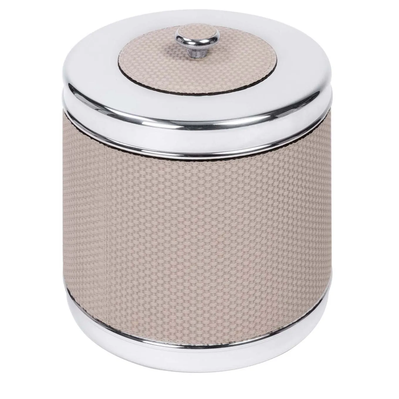 Partially leather-covered insulated double-chamber steel ice bucket with chrome-plated finish. Provided with lid.